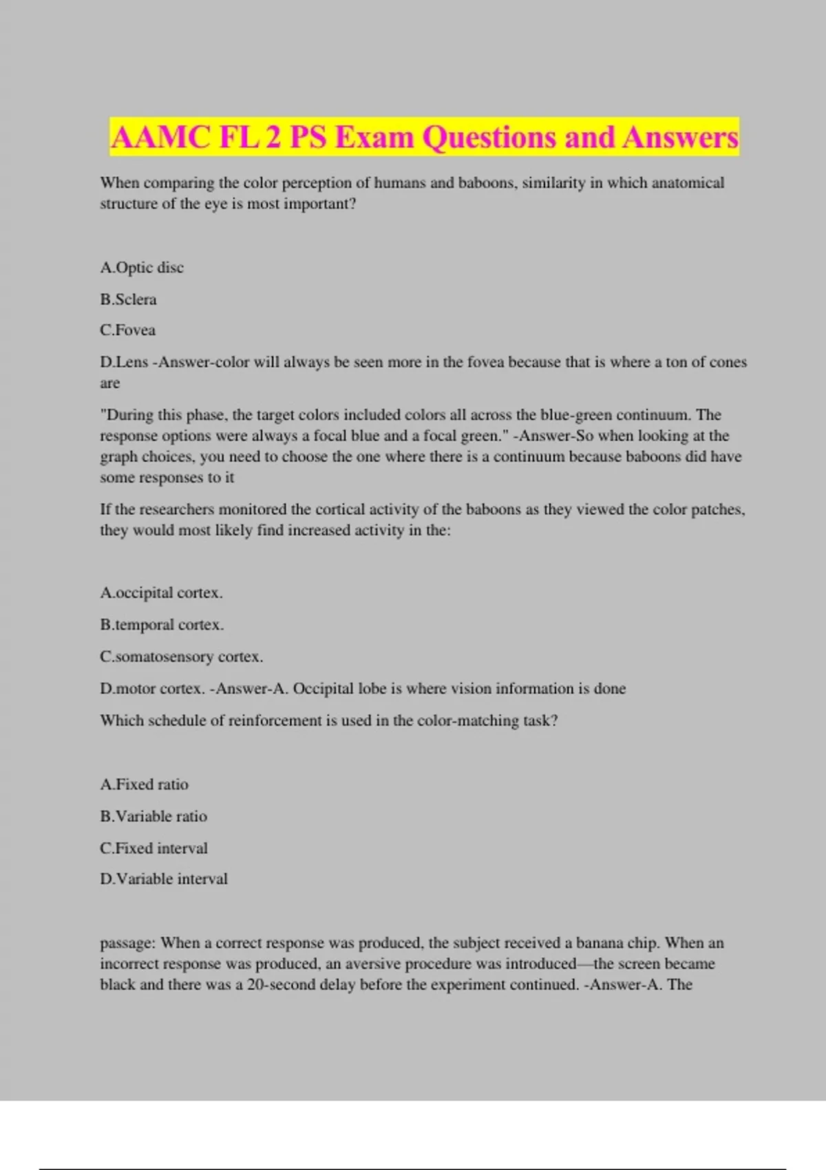 AAMC FL 2 PS Exam Questions and Answers When comparing the color perception of humans and baboons, similarity in which anatomical structure of the eye is most important? A.Optic disc B.Sclera C.Fovea D.Lens -Answer-color will always be seen more in the fovea because that is where a ton of cones are "During this phase, the target colors included colors all across the blue-green continuum. The response options were always a focal blue and a focal green." -Answer-So when looking at the graph choices, you need to choose the one where there is a continuum because baboons did have some responses to it If the researchers monitored the cortical activity of the baboons as they viewed the color patches, they would most likely find increased activity in the: A.occipital cortex. B.temporal cortex. C.somatosensory cortex. D.motor cortex. -Answer-A. Occipital lobe is where vision information is done Which schedule of reinforcement is used in the color-matching task? A.Fixed ratio B.Variable ratio C.Fixed interval D.Variable interval passage: When a correct response was produced, the subject received a banana chip. When an incorrect response was produced, an aversive procedure was introduced—the screen became black and there was a 20-second delay before the experiment continued. -Answer-A. The passage states that the subjects received a banana chip every time they responded correctly, which is an example of a fixed ratio schedule of reinforcement. The description of assimilation patterns in the passage (final paragraph) suggests that there is geographic variation in which pair of concepts? A.Social status and roles B.Social and cultural capital C.Cultural values and norms D.Material and symbolic culture Passage: Variation regarding how immigrants adopt the local traditions and behavioral standards in a region can lead to distinct geographic patterns of assimilation. -Answer-assimilation is all about conforming to what the new culture's norms. This goes along with C. Which historical factor primarily accounts for the projected increase in the population aged 65 and older in the United States? A.The increased immigration rate since the 1950s B.The increased fertility rate after World War II C.The sexual revolution of the 1960s and 1970s D.The relative deprivation of the Great Depression -Answer-BABY BOOM :) B. To explain the demographic dynamics in the passage, a conflict theorist is most likely to consider the relationship among which factors? A.Age, medicalization, and the illness experience B.Generational status, social solidarity, and the welfare state C.Age, social isolation, and networks of social support D.Generational status, political power, and resource allocation -Answer-Conflict= power; D. A- social constructivism B- functionalism C- symbolic interactionism (far stretch) The aging of the U.S. population is most likely to increase: A.the dependency ratio. B.the social gradient in health. C.the life course perspective. D.the intersectionality of medicine. -Answer-A. dependency ratio is when there are more elderly or super young people relying on other people who are working Which finding best supports the linguistic relativity hypothesis? A.All languages have a word for "up" and a word for "down." B.Humans are better at learning words for primary colors than for secondary colors. C.Some languages do not have words for "right" and "left." D.Humans are better at distinguishing colors for which their language has a name. -Answer-D. The linguistic relativity hypothesis says that people distinguish things better when they understand it from their language. this correlate