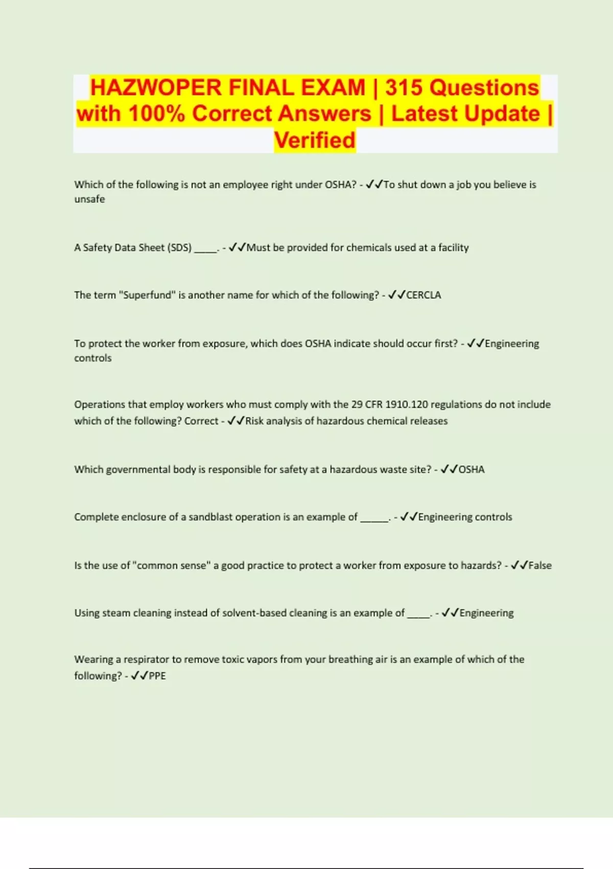 HAZWOPER FINAL EXAM 315 Questions with 100% Correct Answers Latest Update Verified.docx