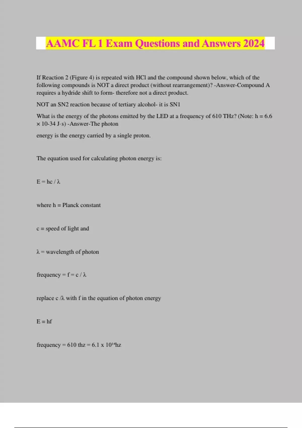 AAMC FL 1 Exam Questions and Answers 2024 If Reaction 2 (Figure 4) is repeated with HCl and the compound shown below, which of the following compounds is NOT a direct product (without rearrangement)? -Answer-Compound A requires a hydride shift to form- therefore not a direct product. NOT an SN2 reaction because of tertiary alcohol- it is SN1 What is the energy of the photons emitted by the LED at a frequency of 610 THz? (Note: h = 6.6 × 10-34 J·s) -Answer-The photon energy is the energy carried by a single proton. The equation used for calculating photon energy is: E = hc / λ where h = Planck constant c = speed of light and λ = wavelength of photon frequency = f = c / λ replace c /λ with f in the equation of photon energy E = hf frequency = 610 thz = 6.1 x 10¹⁴hz h = 6.26 x 10⁻³⁴ js E = 6.26 x 10⁻³⁴ x 6.1 x 10¹⁴ E = 3.8 x 10⁻¹⁹ j Which amino acid residues were incorporated into Compound 1 to promote the adhesion of cells on the scaffold surfaces? -Answer-The passage describes the five regions of the compound, identification of the amino acids within the five regions provides the answer. Compound 1 was designed to exhibit pH-dependent self-assembly. What feature(s) of the molecule is(are) responsible for the pH dependence of aggregation (Equation 1)? -Answer-Side chains whose net charge responds to pH The answer is because the molecule contains mainly acidic side chains that were deprotonated and negatively charged at high pH. This inhibited aggregation due to electrostatic principles. At low pH these groups are neutral and allow aggregation. Why is the velocity of blood flow slower in capillaries than in arteries? -Answer-Capillaries in the body pump blood at a slower velocity than arteries, because even though arteries are larger individually, the total area of capillaries throughout the body is greater. On an individual basis though, vasoconstrictors like epinephrine cause arteries (the smaller ones that are composed of more smooth muscle) to narrow which increases blood flow. Darcy's Law (Continuity Equation) where Q=Av. If A increases, v decreases since blood flow volume is constant The source of the phosphate groups that are added to rhodopsin is: -Answer-Kinases are enzymes that posphorylate molecules, not the actual source. ATP (along with other NTPs) are typically your source of phosphate groups Which reaction is catalyzed by LipA? -Answer-LipA is a lipase, which means it must hydrolyze fatty acids Compared to the wild-type LipA, what is the change in net charge in variant XI at pH 7? - Answer-So you look at the table of amino acid substitutions for variant XI R33G, K112D, M134D, Y139C, I157M The first letter is the WT, the last is the substitution. At pH=7 you need to figure out the change in charge for each aa. For example, R= arginine has a pkA of 12.5, pH < pkA it will be protonated so the charge is +1; G = Glycine is neutral so you are substituting the +1 charge with a charge of 0. If you do this for all of them you'll get original: +2 substitution: -2 which is a -4 difference. By what factor is the proton concentration increased in the experiments shown in Figure 1B from those shown in Figure 1A? -Answer-The answer to this question is D because the pH scale is logarithmic (pH = −log([H+]). A difference of 3 pH units corresponds to a 103 = 1000-fold difference in proton concentrations. It is a Scientific Reasoning and Problem Solving question because you are asked to determine and then use a formula to solve a scientific problem. Addition of laforin to the reaction mixtures used to generate the data in Figure 2 will result in - Answer-The SDS-PAGE on the left has 14C tagged glucose, and so is also a control to see how much glucose is incorporated into the glycogen. Laforin should not affect this, so we rule out the answers involving 14C. The SDS-PAGE on the right has 32P tags, which marks phosphorylation activity of our glycogen. Laforin, which is a phosphatase, should remove radiotagged phosphate from our glycogen, so the band should be less intense, as compared to a reaction mixture without laforin, which would have radiotagged phosphate still on the glycogen backbone (meaning we see a more intense band) Compared to normal glycogen, the amount of what type of bond is decreased in Lafora bodies? - Answer-Well glycogen has alpha 1,4 bonds as its "main" bonds, but any branches it has are alpha 1,6. If lafora bodies are sparsely branched glycogen-like polymers, it means that they have even less branching and less alpha 1,6 bonds than regular glycogen. In the above figure, an object O is at a distance of three focal lengths from the center of a convex lens. What is the ratio of the height of the image to the height of the object? -Answer-0.5 The question is asking for the ratio of the height of the image to the height of the object. First we must find the distance to the lens, using a variation of the thin lens equation: 1/f = 1/do + 1/di (do)(di)/(do-di) = distance to lens (f) (f)/(do) = ratio of the height of the image to the height of the object A circuit similar to that in Figure 2 is set up. It has a potential of 2.0 V. Assume that the resistance in the circuit is negligible compared to th