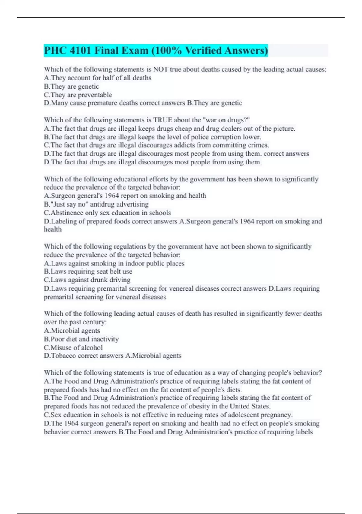 Which of the following statements is NOT true about deaths caused by the leading actual causes: A.They account for half of all deaths B.They are genetic C.They are preventable D.Many cause premature deaths correct answers B.They are genetic Which of the following statements is TRUE about the "war on drugs?" A.The fact that drugs are illegal keeps drugs cheap and drug dealers out of the picture. B.The fact that drugs are illegal keeps the level of police corruption lower. C.The fact that drugs are illegal discourages addicts from committing crimes. D.The fact that drugs are illegal discourages most people from using them. correct answers D.The fact that drugs are illegal discourages most people from using them. Which of the following educational efforts by the government has been shown to significantly reduce the prevalence of the targeted behavior: A.Surgeon general's 1964 report on smoking and health B."Just say no" antidrug advertising C.Abstinence only sex education in schools D.Labeling of prepared foods correct answers A.Surgeon general's 1964 report on smoking and health Which of the following regulations by the government have not been shown to significantly reduce the prevalence of the targeted behavior: A.Laws against smoking in indoor public places B.Laws requiring seat belt use C.Laws against drunk driving D.Laws requiring premarital screening for venereal diseases correct answers D.Laws requiring premarital screening for venereal diseases Which of the following leading actual causes of death has resulted in significantly fewer deaths over the past century: A.Microbial agents B.Poor diet and inactivity C.Misuse of alcohol D.Tobacco correct answers A.Microbial agents Which of the following statements is true of education as a way of changing people's behavior? A.The Food and Drug Administration's practice of requiring labels stating the fat content of prepared foods has had no effect on the fat content of people's diets. B.The Food and Drug Administration's practice of requiring labels stating the fat content of prepared foods has not reduced the prevalence of obesity in the United States. C.Sex education in schools is not effective in reducing rates of adolescent pregnancy. D.The 1964 surgeon general's report on smoking and health had no effect on people's smoking behavior correct answers B.The Food and Drug Administration's practice of requiring labels