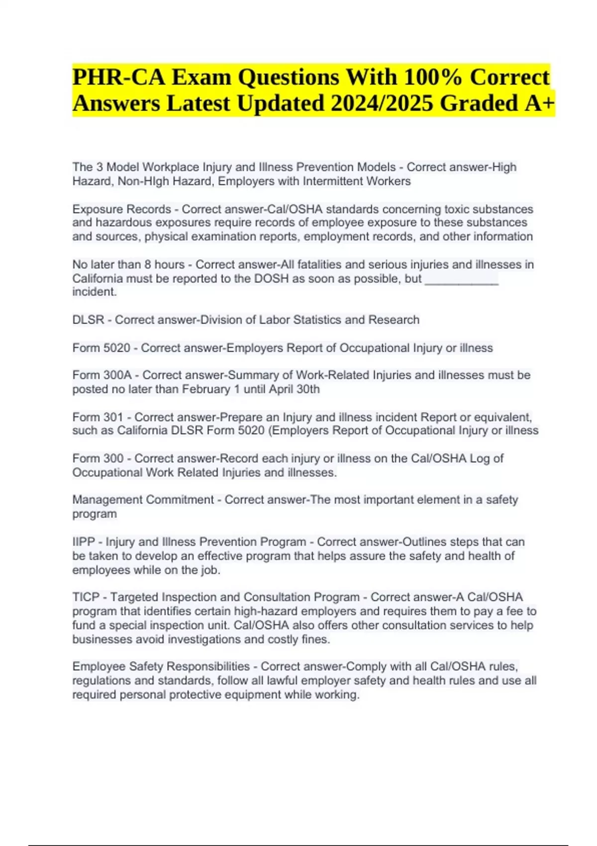 PHR-CA Exam Questions With 100% Correct Answers Latest Updated 2024/2025 (Graded A+) The 3 Model Workplace Injury and Illness Prevention Models - Correct answer-High Hazard, Non-HIgh Hazard, Employers with Intermittent Workers Exposure Records - Correct answer-Cal/OSHA standards concerning toxic substances and hazardous exposures require records of employee exposure to these substances and sources, physical examination reports, employment records, and other information No later than 8 hours - Correct answer-All fatalities and serious injuries and illnesses in California must be reported to the DOSH as soon as possible, but ___________ incident. DLSR - Correct answer-Division of Labor Statistics and Research Form 5020 - Correct answer-Employers Report of Occupational Injury or illness Form 300A - Correct answer-Summary of Work-Related Injuries and illnesses must be posted no later than February 1 until April 30th Form 301 - Correct answer-Prepare an Injury and illness incident Report or equivalent, such as California DLSR Form 5020 (Employers Report of Occupational Injury or illness Form 300 - Correct answer-Record each injury or illness on the Cal/OSHA Log of Occupational Work Related Injuries and illnesses. Management Commitment - Correct answer-The most important element in a safety program IIPP - Injury and Illness Prevention Program - Correct answer-Outlines steps that can be taken to develop an effective program that helps assure the safety and health of employees while on the job. TICP - Targeted Inspection and Consultation Program - Correct answer-A Cal/OSHA program that identifies certain high-hazard employers and requires them to pay a fee to fund a special inspection unit. Cal/OSHA also offers other consultation services to help businesses avoid investigations and costly fines. Employee Safety Responsibilities - Correct answer-Comply with all Cal/OSHA rules, regulations and standards, follow all lawful employer safety and health rules and use all required personal protective equipment while working. PHR-CA Exam Questions With 100% Correct Answers Latest Updated 2024/2025 Graded A+ Governor's Office of Emergency Services - Correct answer-Generally the lead state agency for emergency management in California California Occupational Safety and Standards Board - Correct answer-The standardssetting body under Cal/OSHA and has the authority to grant or deny applications for variances from adopted standards and respond to petitions for new or revised standards. Cal/OSHA Appeals Board - Correct answer-This board handles appeals from employers regarding citations issued by DOSH for alleged violations of workplace safety and health laws. DIR - Department of Industrial Relations - Correct answer-improves conditions for California's workers and advances opportunities for employers. This department has four divisions and six commissions, boards and programs GISO - General Industry Safety Orders - Correct answer-The purpose is to fulfill the expressed social public policy of the State of California to make full provision for securing safety in places of employment. Title 8 of the California Code of Regulations - Correct answer-Requires every California employer to have an effective Injury and Illness Prevention Program. DOSH - Division of Occupational Safety and Health - Correct answer-The California Division of Occupational Safety and Health (DOSH) is commonly (although incorrectly) referred to as Cal/OSHA. DOSH sets the standards for workplace safety in California. Valid - Correct answer-To avoid running afoul FEHA laws, an employer must be able to show that the particular pre-employment test is _____________ (I.e., has a manifest relationship to the employment position) Whistle Blower Protection - Correct answer-When adverse action is taken against an employee for reporting information that is either a violation of state or federal law, or noncompliance with local, state, or federal regulation. Conciliation - Correct answer-If the investigation does show a violation of the law, it will attempt to settle the case using a formal ___________ process. Close the case. - Correct answer-If the investigation does not show a violation of the law, the DFEH will ___________. First Step in the Complaint Process for Discrimination - Correct answer-Submit the Complaint to the DFEH. Employees who feel that they have experienced unlawful harassment or discrimination, and have exhausted the available remedies through their employer, if applicable, can submit their complaint online, over the phone, in person, or through the mail. Not Reasons for Disability Discrimination - Correct answer-1) There is a possibility of future harm to the person or to others 2) That employing individuals with a disability will cause an employer's insurance rates to rise Pregnancy, Childbirth or Related Medical Condition - Correct answer-Pregnancy leave is required only when a woman is actually disabled by her______________________. Drug or Alcohol Rehabilitation Programs - Correct answer-California employers with at least twenty five employees need to be accommodating to employees who voluntarily decide to enter a _____________________________; as long as the leave does not create an undue hardship for the employer. Section 132a - Correct answer-Employers can violate Labor Code _____________________ if they terminate or discriminate against an employee for filing a Workers' Compensation claim. Workers' Compensation Leave - Correct answer-Employers should do everything in their power to allow injured employees the time off to recover from their workplace injury or illness. Lactation Accomodations - Correct answer-Under California law, employers are required to provide a reasonable amount of time for __________________________ to express breastmilk during the workday. Job Protection - Correct answer-Employees out on PDL or CFRA are entitled to be reinstated to the same position with the same benefits and seniority as they had pr