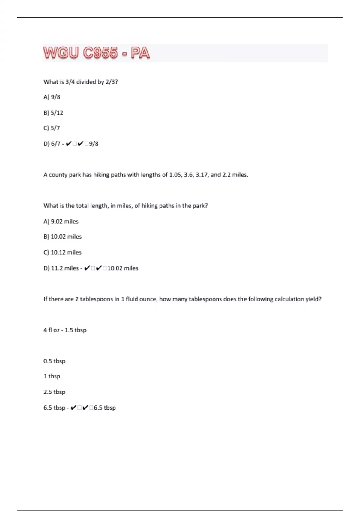 What is 3/4 divided by 2/3? A) 9/8 B) 5/12 C) 5/7 D) 6/7 - ️️9/8 A county park has hiking paths with lengths of 1.05, 3.6, 3.17, and 2.2 miles. What is the total length, in miles, of hiking paths in the park? A) 9.02 miles B) 10.02 miles C) 10.12 miles D) 11.2 miles - ️️10.02 miles If there are 2 tablespoons in 1 fluid ounce, how many tablespoons does the following calculation yield? 4 fl oz - 1.5 tbsp 0.5 tbsp 1 tbsp 2.5 tbsp 6.5 tbsp - ️️6.5 tbsp