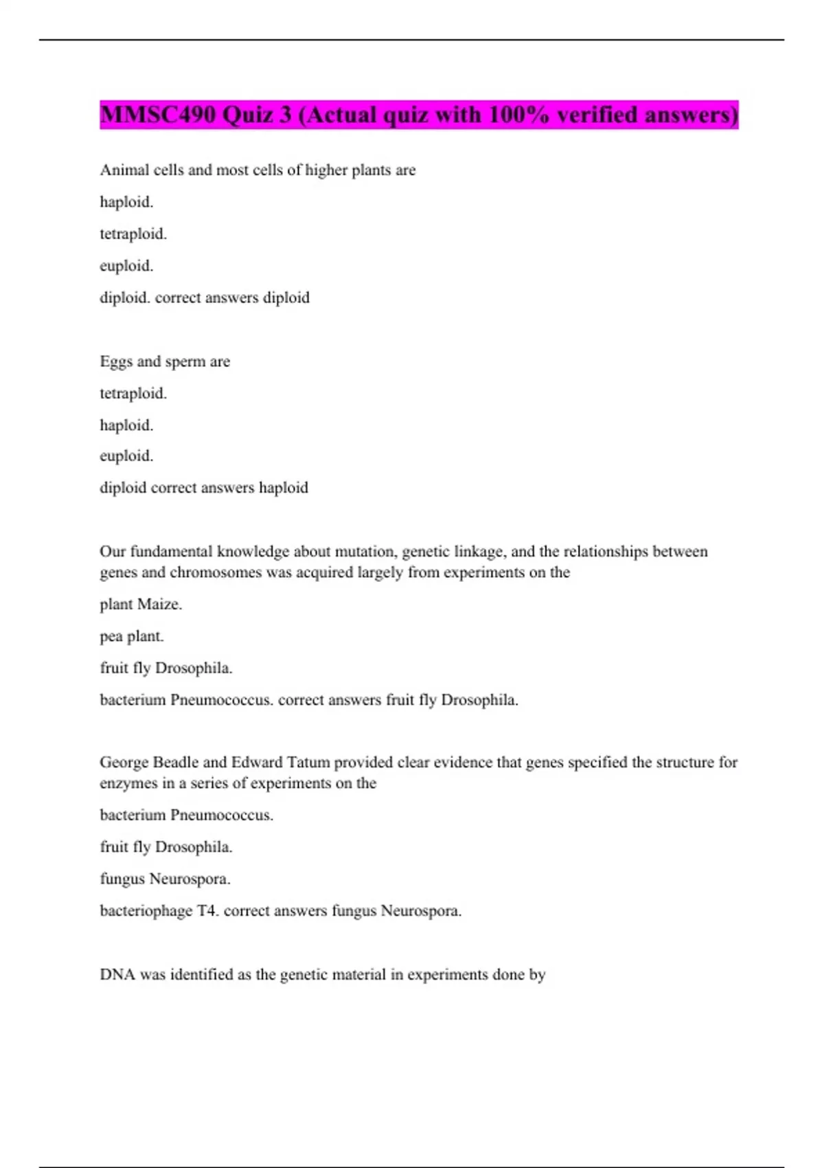 Eggs and sperm are tetraploid. haploid. euploid. diploid correct answers haploid Animal cells and most cells of higher plants are haploid. tetraploid. euploid. diploid. correct answers diploid Our fundamental knowledge about mutation, genetic linkage, and the relationships between genes and chromosomes was acquired largely from experiments on the plant Maize. pea plant. fruit fly Drosophila. bacterium Pneumococcus. correct answers fruit fly Drosophila. George Beadle and Edward Tatum provided clear evidence that genes specified the structure for enzymes in a series of experiments on the bacterium Pneumococcus. fruit fly Drosophila. fungus Neurospora. bacteriophage T4. correct answers fungus Neurospora. DNA was identified as the genetic material in experiments done by