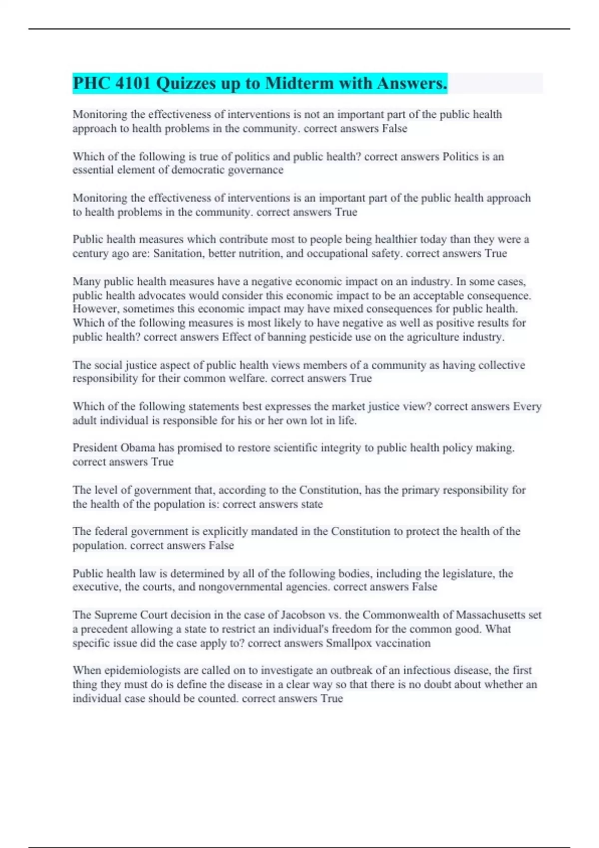 Monitoring the effectiveness of interventions is not an important part of the public health approach to health problems in the community. correct answers False Which of the following is true of politics and public health? correct answers Politics is an essential element of democratic governance Monitoring the effectiveness of interventions is an important part of the public health approach to health problems in the community. correct answers True Public health measures which contribute most to people being healthier today than they were a century ago are: Sanitation, better nutrition, and occupational safety. correct answers True Many public health measures have a negative economic impact on an industry. In some cases, public health advocates would consider this economic impact to be an acceptable consequence. However, sometimes this economic impact may have mixed consequences for public health. Which of the following measures is most likely to have negative as well as positive results for public health? correct answers Effect of banning pesticide use on the agriculture industry. The social justice aspect of public health views members of a community as having collective responsibility for their common welfare. correct answers True Which of the following statements best expresses the market justice view? correct answers Every adult individual is responsible for his or her own lot in life. President Obama has promised to restore scientific integrity to public health policy making. correct answers True The level of government that, according to the Constitution, has the primary responsibility for the health of the population is: correct answers state The federal government is explicitly mandated in the Constitution to protect the health of the population. correct answers False Public health law is determined by all of the following bodies, including the legislature, the executive, the courts, and nongovernmental agencies. correct answers False The Supreme Court decision in the case of Jacobson vs. the Commonwealth of Massachusetts set a precedent allowing a state to restrict an individual's freedom for the common good. What specific issue did the case apply to? correct answers Smallpox vaccination When epidemiologists are called on to investigate an outbreak of an infectious disease, the first thing they must do is define the disease in a clear way so that there is no doubt about whether an individual case should be counted. correct answers True