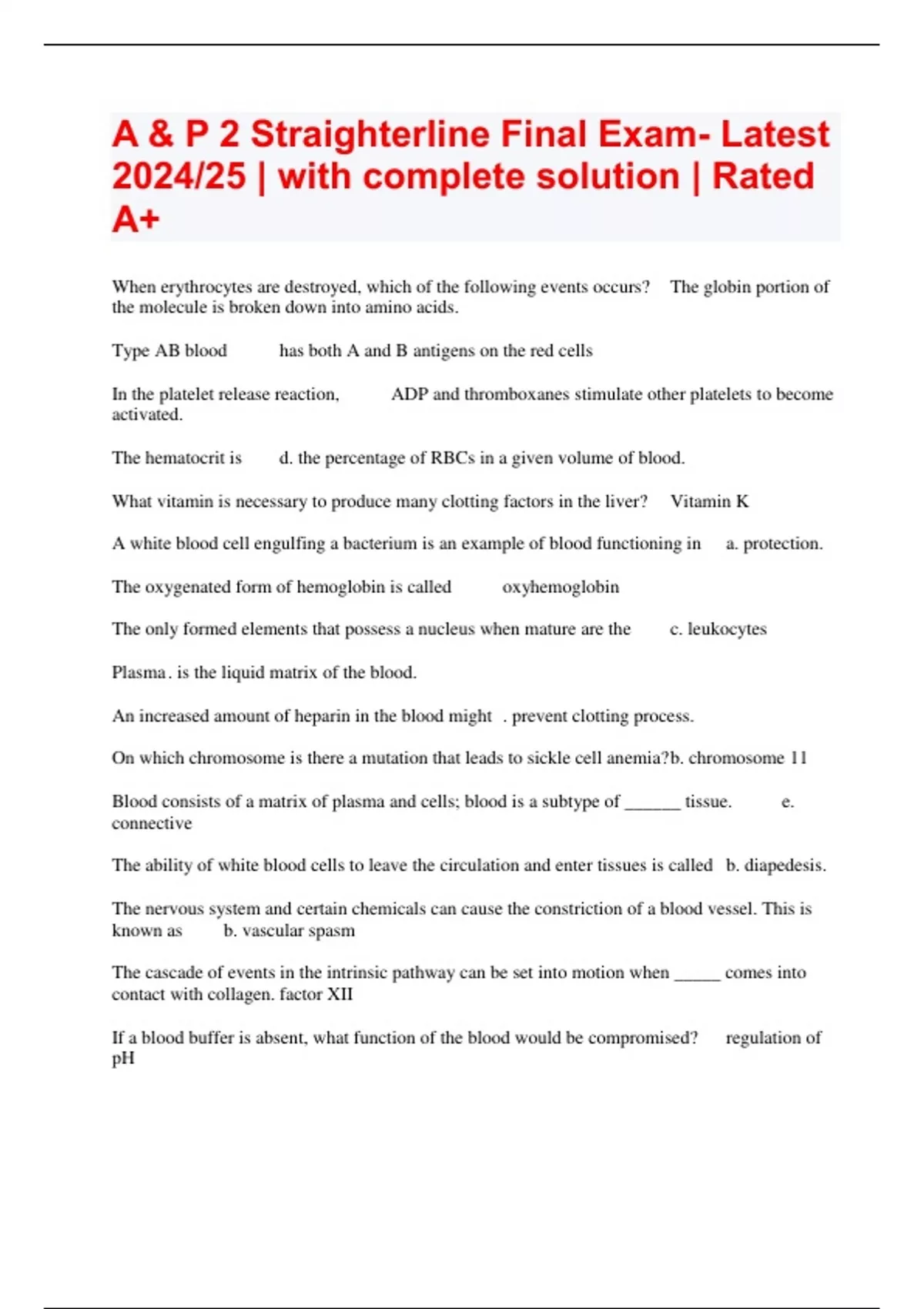 A & P 2 Straighterline Final Exam- Latest 2024/25 | with complete solution | Rated A+