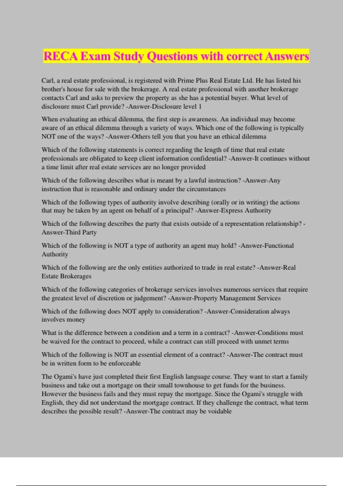 RECA Exam Study Questions with correct Answers Carl, a real estate professional, is registered with Prime Plus Real Estate Ltd. He has listed his brother's house for sale with the brokerage. A real estate professional with another brokerage contacts Carl and asks to preview the property as she has a potential buyer. What level of disclosure must Carl provide? -Answer-Disclosure level 1 When evaluating an ethical dilemma, the first step is awareness. An individual may become aware of an ethical dilemma through a variety of ways. Which one of the following is typically NOT one of the ways? -Answer-Others tell you that you have an ethical dilemma Which of the following statements is correct regarding the length of time that real estate professionals are obligated to keep client information confidential? -Answer-It continues without a time limit after real estate services are no longer provided Which of the following describes what is meant by a lawful instruction? -Answer-Any instruction that is reasonable and ordinary under the circumstances Which of the following types of authority involve describing (orally or in writing) the actions that may be taken by an agent on behalf of a principal? -Answer-Express Authority Which of the following describes the party that exists outside of a representation relationship? - Answer-Third Party Which of the following is NOT a type of authority an agent may hold? -Answer-Functional Authority Which of the following are the only entities authorized to trade in real estate? -Answer-Real Estate Brokerages Which of the following categories of brokerage services involves numerous services that require the greatest level of discretion or judgement? -Answer-Property Management Services Which of the following does NOT apply to consideration? -Answer-Consideration always involves money What is the difference between a condition and a term in a contract? -Answer-Conditions must be waived for the contract to proceed, while a contract can still proceed with unmet terms Which of the following is NOT an essential element of a contract? -Answer-The contract must be in written form to be enforceable The Ogami's have just completed their first English language course. They want to start a family business and take out a mortgage on their small townhouse to get funds for the business. However the business fails and they must repay the mortgage. Since the Ogami's struggle with English, they did not understand the mortgage contract. If they challenge the contract, what term describes the possible result? -Answer-The contract may be voidable Which of the following is NOT characteristic of value in relation to a commodity? -Answer- Pricing Advisory Note -Answer-Which of the following Professional Conduct Review outcomes is issued as a practice guideline for a technical breach of the legislation? B) Statements II, III and IV -Answer-Which of the following statements is correct regarding the Real Estate Act Rules? The Rules may only be amended by the provincial legislature RECA posts the most current version of the Rules on its website The Rules refer to the standards of practice for industry professionals When contemplating amendments to the Rules, RECA consults with industry professionals and stakeholders Social Reaction -Answer-Which of the following is NOT a type of reaction associated with conflicts or disputes? Personal Information Protection Act -Answer-Which of the following is the provincial privacy legislation in Alberta? Authority, responsibility and accountability -Answer-In terms of the brokerage, what are the 3 components of leadership that relate to the broker? It should state that the consumer received and understands the written disclosure made by a real estate professional -Answer-Which of the following best describes a written acknowledgement? Customary authority -Answer-Which of the following types of authority allow an agent to act according to the usual ways of performing an action as established by the profession? Only some general obligations -Answer-Which
