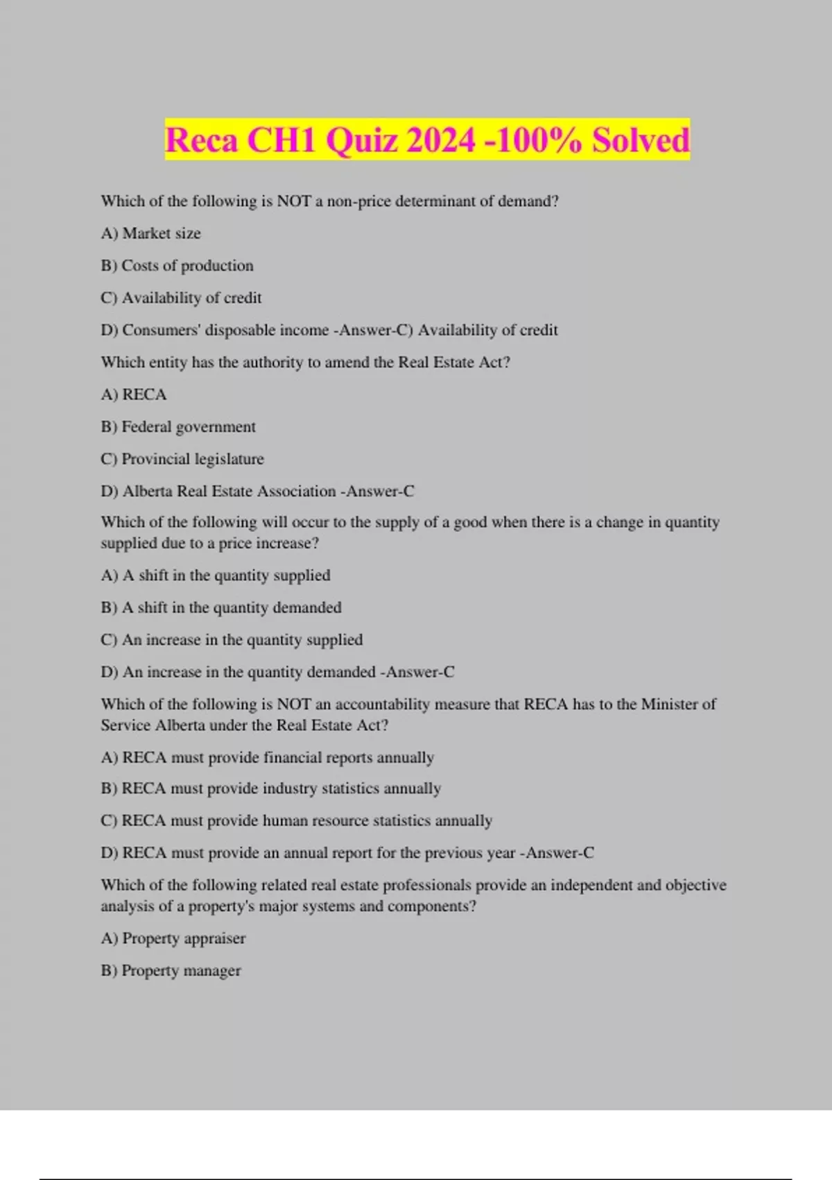 Reca CH1 Quiz 2024 -100% Solved Which of the following is NOT a non-price determinant of demand? A) Market size B) Costs of production C) Availability of credit D) Consumers' disposable income -Answer-C) Availability of credit Which entity has the authority to amend the Real Estate Act? A) RECA B) Federal government C) Provincial legislature D) Alberta Real Estate Association -Answer-C Which of the following will occur to the supply of a good when there is a change in quantity supplied due to a price increase? A) A shift in the quantity supplied B) A shift in the quantity demanded C) An increase in the quantity supplied D) An increase in the quantity demanded -Answer-C Which of the following is NOT an accountability measure that RECA has to the Minister of Service Alberta under the Real Estate Act? A) RECA must provide financial reports annually B) RECA must provide industry statistics annually C) RECA must provide human resource statistics annually D) RECA must provide an annual report for the previous year -Answer-C Which of the following related real estate professionals provide an independent and objective analysis of a property's major systems and components? A) Property appraiser B) Property manager C) Property measurer D) Property inspector -Answer-D What is the occupancy rate for a housing complex that has a total of 20 units of which 15 are occupied? A) 25% B) 33% C) 43% D) 75% -Answer-D Which of the following is an influencing factor that may cause the quantity demanded for a good or service to shift? A) A change in consumer tastes B) A change in consumer expectations C) A change in the number of consumers D) All the statements apply -Answer-D Which of the following is NOT a non-price determinant of demand? A) Market size B) Costs of production C) Availability of credit D) Consumers' disposable income -Answer-B Which of the following statements is correct regarding the resource markets? A) They measure the total output of an economy B) They determine the level of supply and demand C) They measure the level of consumer confidence D) They facilitate the exchange of the factors of production -Answer-D Which of the following statements is NOT correct regarding the term demographics? A) It measures the total output of an economy B) It can affect the supply of, and demand for, real estate C) It is the study of the characteristics of human populations D) It includes statistical data such as age, gender, and ethnicity -Answer-A