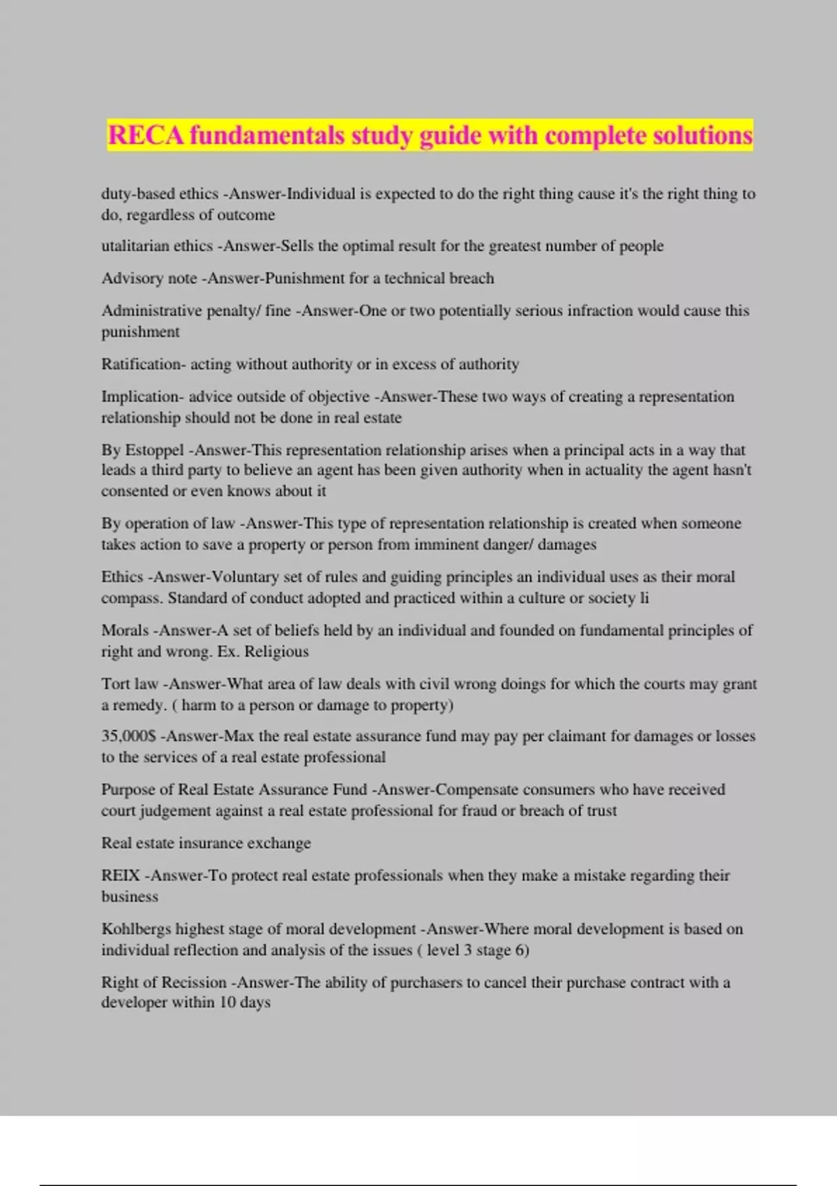 RECA fundamentals study guide with complete solutions duty-based ethics -Answer-Individual is expected to do the right thing cause it's the right thing to do, regardless of outcome utalitarian ethics -Answer-Sells the optimal result for the greatest number of people Advisory note -Answer-Punishment for a technical breach Administrative penalty/ fine -Answer-One or two potentially serious infraction would cause this punishment Ratification- acting without authority or in excess of authority Implication- advice outside of objective -Answer-These two ways of creating a representation relationship should not be done in real estate By Estoppel -Answer-This representation relationship arises when a principal acts in a way that leads a third party to believe an agent has been given authority when in actuality the agent hasn't consented or even knows about it By operation of law -Answer-This type of representation relationship is created when someone takes action to save a property or person from imminent danger/ damages Ethics -Answer-Voluntary set of rules and guiding principles an individual uses as their moral compass. Standard of conduct adopted and practiced within a culture or society li Morals -Answer-A set of beliefs held by an individual and founded on fundamental principles of right and wrong. Ex. Religious Tort law -Answer-What area of law deals with civil wrong doings for which the courts may grant a remedy. ( harm to a person or damage to property) 35,000$ -Answer-Max the real estate assurance fund may pay per claimant for damages or losses to the services of a real estate professional Purpose of Real Estate Assurance Fund -Answer-Compensate consumers who have received court judgement against a real estate professional for fraud or breach of trust Real estate insurance exchange REIX -Answer-To protect real estate professionals when they make a mistake regarding their business Kohlbergs highest stage of moral development -Answer-Where moral development is based on individual reflection and analysis of the issues ( level 3 stage 6) Right of Recission -Answer-The ability of purchasers to cancel their purchase contract with a developer within 10 days Condominium -Answer-Ownership in common with others CADS -Answer-If someone forgets the condo management company name for any reason where would they find it General power of attorney -Answer-Can make all decisions about finances or legal affairs has no limit other then where they'll live or health care Yes -Answer-Will power or at tourney be on the title building permit -Answer-Permit that applies to specific project that is an improvement to the property development permit -Answer-Permit that applies to overall use of the land It was legal at time of development -Answer-Non conforming suite means ? Waterworks Repair of roads Ambulance -Answer-Municipal special taxes are for Business revitalization tax -Answer-Taxes used in a business district to improve beauty, parking, or promote 24 hrs -Answer-Landlord may enter without consent but with notice after giving how much notice Assignment -Answer-Tenant isn't returning to the property so all obligations and rights go to the new tenant Sublease -Answer-Tenant will be returning to the property, and they're still liable to the landlord Condominium Property Act -Answer-Condos are governed by the Agricultural and recreational land ownership act -Answer-This act prevents non Canadians from buying significant amounts of prime land Personal information -Answer-Refers to information that makes an individual identifiable FINTRAC -Answer-Real Estate brokerages must re