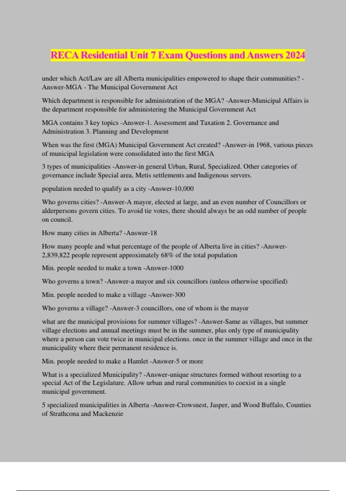 RECA Residential Unit 7 Exam Questions and Answers 2024 under which Act/Law are all Alberta municipalities empowered to shape their communities? - Answer-MGA - The Municipal Government Act Which department is responsible for administration of the MGA? -Answer-Municipal Affairs is the department responsible for administering the Municipal Government Act MGA contains 3 key topics -Answer-1. Assessment and Taxation 2. Governance and Administration 3. Planning and Development When was the first (MGA) Municipal Government Act created? -Answer-in 1968, various pieces of municipal legislation were consolidated into the first MGA 3 types of municipalities -Answer-in general Urban, Rural, Specialized. Other categories of governance include Special area, Metis settlements and Indigenous servers. population needed to qualify as a city -Answer-10,000 Who governs cities? -Answer-A mayor, elected at large, and an even number of Councillors or alderpersons govern cities. To avoid tie votes, there should always be an odd number of people on council. How many cities in Alberta? -Answer-18 How many people and what percentage of the people of Alberta live in cities? -Answer- 2,839,822 people represent approximately 68% of the total population Min. people needed to make a town -Answer-1000 Who governs a town? -Answer-a mayor and six councillors (unless otherwise specified) Min. people needed to make a village -Answer-300 Who governs a village? -Answer-3 councillors, one of whom is the mayor what are the municipal provisions for summer villages? -Answer-Same as villages, but summer village elections and annual meetings must be in the summer, plus only type of municipality where a person can vote twice in municipal elections. once in the summer village and once in the municipality where their permanent residence is. Min. people needed to make a Hamlet -Answer-5 or more What is a specialized Municipality? -Answer-unique structures formed without resorting to a special Act of the Legislature. Allow urban and rural communities to coexist in a single municipal government. 5 specialized municipalities in Alberta -Answer-Crowsnest, Jasper, and Wood Buffalo, Counties of Strathcona and Mackenzie How is a bare land condominium defined? -Answer-By the size of the lot the building sits on. A RPR identifies lot boundaries. The area within the boundary of the RPR, including structure, landscaping and garage, are owned by the unit owner. Areas outside the RPR boundaries are common property and owned by all unit owners What is Fractional Ownership -Answer-owning 1/4 to 1/13th of a property with other individuals What is a HOA? -Answer-A home ownership association is typically registered on a fee simple title. Each property located within the HOA development or community has a separate title with a HOA caveat registered against it. mandatory membership and is based on each residence being part of a specific development or community. Usually requiring the owner to pay an annual or monthly HOA fee. How to know the difference between a condominium and a Home Ownership Association (HOA)? -Answer-For an HOA a caveat is recorded on the title For Time Shares, what is the difference between Fee Simple Ownership and Right-to-use ownership? -Answer-Fee simple means they own the portion/weeks until they sell their ownership/or transfer it to another party. Right-to-use is for a set number of years ranging from 15 to 50 years. How do you find out if a property is a condominium? -Answer-Must search the certificate of title 3 types of Condominium Plans -Answer-Conventional, Bare land and Barely Blended Condominium Plans - Conventional -Answer-In a Conventional Condominium Plan, units are defined spaces within a structure. The interior finish on floors, walls, and ceilings, unless otherwise stipulated in the Legend on the Plan, distinguish the boundaries for units. Unit boundaries for Conventional Condominium Plans registered prior to January 1, 1979, are considered to lie in the centre of floors, walls, and ceilings. All areas not included in the units are considered as part of the common property. Condominium Plans - Bare land -Answer-In a Bare Land Condominium Plan, units are parcels of land. The boundaries for each unit within a bare land condominium plan are defined by the width and depth of each parcel of land. They are identified using survey monuments (e.g. steel pins, wooden stakes) placed on or under the ground. Although improvements (e.g. buildings, fences, roadways) may be added later, the boundaries for units remain as the width and depth of each parcel of land as defined in the Condominium Plan. Unit owners of bare land condominiums possess and are responsible for all improvements fully or partly affixed to the land. There may be rules or bylaws governing these improvements. An associate should ensure that the buyer is aware of and understands the condominium corporation's bylaws and any rules. This is usually contained in the condominium documents provided by the seller. Bare Land Condominium Plans may or may not make provisions for common property. Condominium Plans - Barely Blended -Answer-A Barely Blended Condominium Plan divides bare land units into smaller units with boundaries defined by the space within a structure. Unit boundaries for this type of condominium are