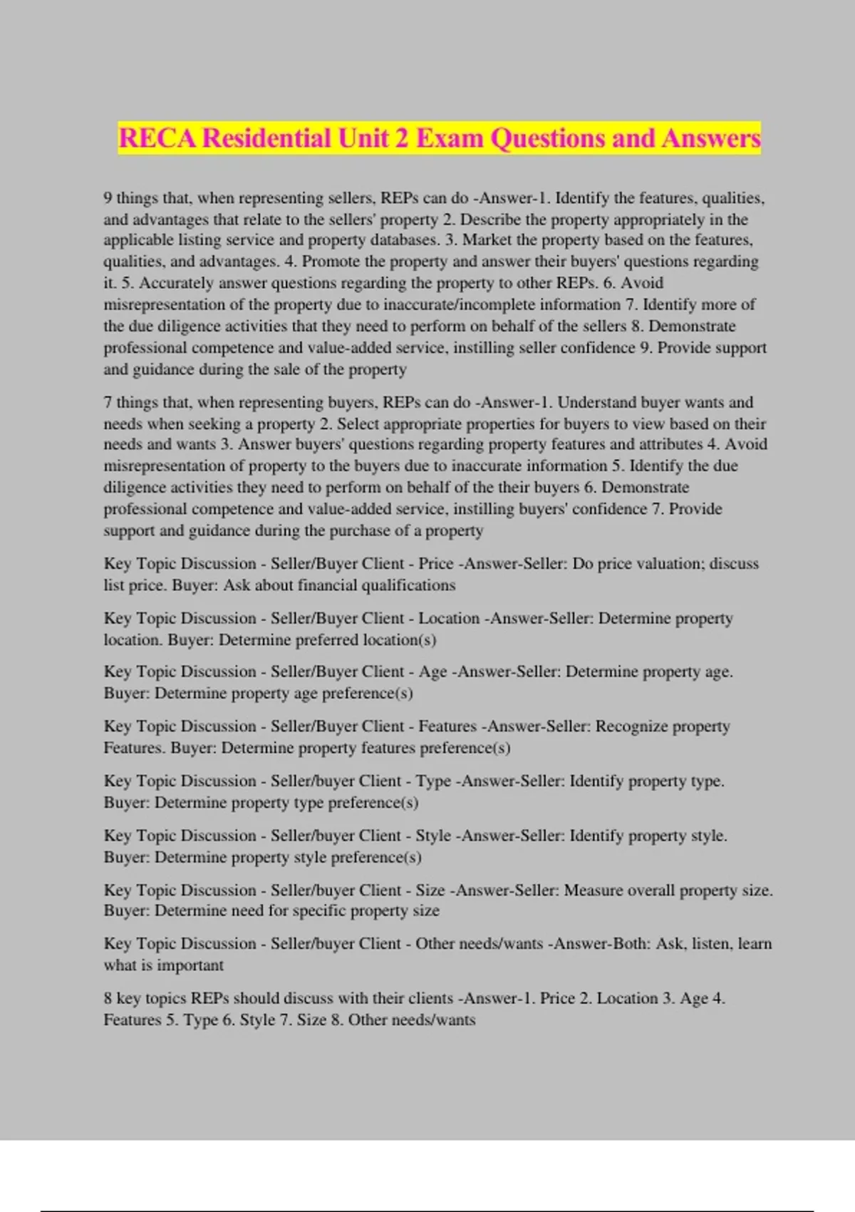 RECA Residential Unit 2 Exam Questions and Answers 9 things that, when representing sellers, REPs can do -Answer-1. Identify the features, qualities, and advantages that relate to the sellers' property 2. Describe the property appropriately in the applicable listing service and property databases. 3. Market the property based on the features, qualities, and advantages. 4. Promote the property and answer their buyers' questions regarding it. 5. Accurately answer questions regarding the property to other REPs. 6. Avoid misrepresentation of the property due to inaccurate/incomplete information 7. Identify more of the due diligence activities that they need to perform on behalf of the sellers 8. Demonstrate professional competence and value-added service, instilling seller confidence 9. Provide support and guidance during the sale of the property 7 things that, when representing buyers, REPs can do -Answer-1. Understand buyer wants and needs when seeking a property 2. Select appropriate properties for buyers to view based on their needs and wants 3. Answer buyers' questions regarding property features and attributes 4. Avoid misrepresentation of property to the buyers due to inaccurate information 5. Identify the due diligence activities they need to perform on behalf of the their buyers 6. Demonstrate professional competence and value-added service, instilling buyers' confidence 7. Provide support and guidance during the purchase of a property Key Topic Discussion - Seller/Buyer Client - Price -Answer-Seller: Do price valuation; discuss list price. Buyer: Ask about financial qualifications Key Topic Discussion - Seller/Buyer Client - Location -Answer-Seller: Determine property location. Buyer: Determine preferred location(s) Key Topic Discussion - Seller/Buyer Client - Age -Answer-Seller: Determine property age. Buyer: Determine property age preference(s) Key Topic Discussion - Seller/Buyer Client - Features -Answer-Seller: Recognize property Features. Buyer: Determine property features preference(s) Key Topic Discussion - Seller/buyer Client - Type -Answer-Seller: Identify property type. Buyer: Determine property type preference(s) Key Topic Discussion - Seller/buyer Client - Style -Answer-Seller: Identify property style. Buyer: Determine property style preference(s) Key Topic Discussion - Seller/buyer Client - Size -Answer-Seller: Measure overall property size. Buyer: Determine need for specific property size Key Topic Discussion - Seller/buyer Client - Other needs/wants -Answer-Both: Ask, listen, learn what is important 8 key topics REPs should discuss with their clients -Answer-1. Price 2. Location 3. Age 4. Features 5. Type 6. Style 7. Size 8. Other needs/wants For representing buyers, REPs are expected to have a general knowledge of the areas in which they practice, including... (x4) -Answer-land use, transportation issues, approved developments, and publicly available information that may influence the decision of the buyers you represent Property features typically relate to... (x4) -Answer-the age, type, style and layout of the property Before residential construction can commence, intial aspects must be addressed such as ...(x2) - Answer-acquiring required permits from the municipality indicating where the residential development will be built and ensuring compliance with the Alberta Building Code during construction 4 types of permits used in the residential construction process -Answer-1. Development permits (sued for new subdivisions) 2. Building Permits (used for new residential buildings 3. Occupancy Permits (used for new residential buildings) 4. Subsequent Building Permits (used for changes to existing buildings) According to the Land Use Bylaw, what must a builder obtain before residential development of any land may occur -Answer-the builder must obtain a Development Permit from the municipality Under the Municipal Government Act (subsection 616) what is required of a Development Permit? -Answer-a Development Permit be issued under a Land Use Bylaw and that it serves as municipality authorization for the proposed development of the land "a Building" meaning under the Municipal Government Act -Answer-The Municipal Government Act (subsection 616) defines a building as anything constructed or placed on, in, over or under land. In a new residential subdivision, is the builder required to obtain a development Permit for the entire subdivision as well as building permits for each individual residence to be constructed within the subdivision? -Answer-Yes. This requires the initial development plan plus the builder must submit building plans to the municipal jurisdiction for each property it intends to build How long are building permits valid? -Answer-Typically, a building permit is valid for one year during which the construction process must be initiated. The length of time to complete the construction of the building varies based on size, complexity, and location. What does the Municipal Government Act allow municipalities to regulate through its land use bylaws? -Answer-to regulate the use, size and type of buildings Does the building permit date represent the exact year the building was built? -Answer-No, Due to allocation of resources, availability of tradespeople, and construction delays that may by caused by supply shortages of material and labour, the building permit date only represents the approximate year the property was constructed What does "ABC" stand for? What does it do? -Answer-Alberta Building Code is the legislation that establishes technical specifications for new building construction and construction materials. is regulating building construction a federal or provincial responsibility -Answer-Provincial. In Canada, provinces and territories are responsible for regulating building construction within their respective jurisdictions. Who created the ABC? And under which Act? -Answer-The Safety Codes Council under the Safety Codes Act created the ABC. What is