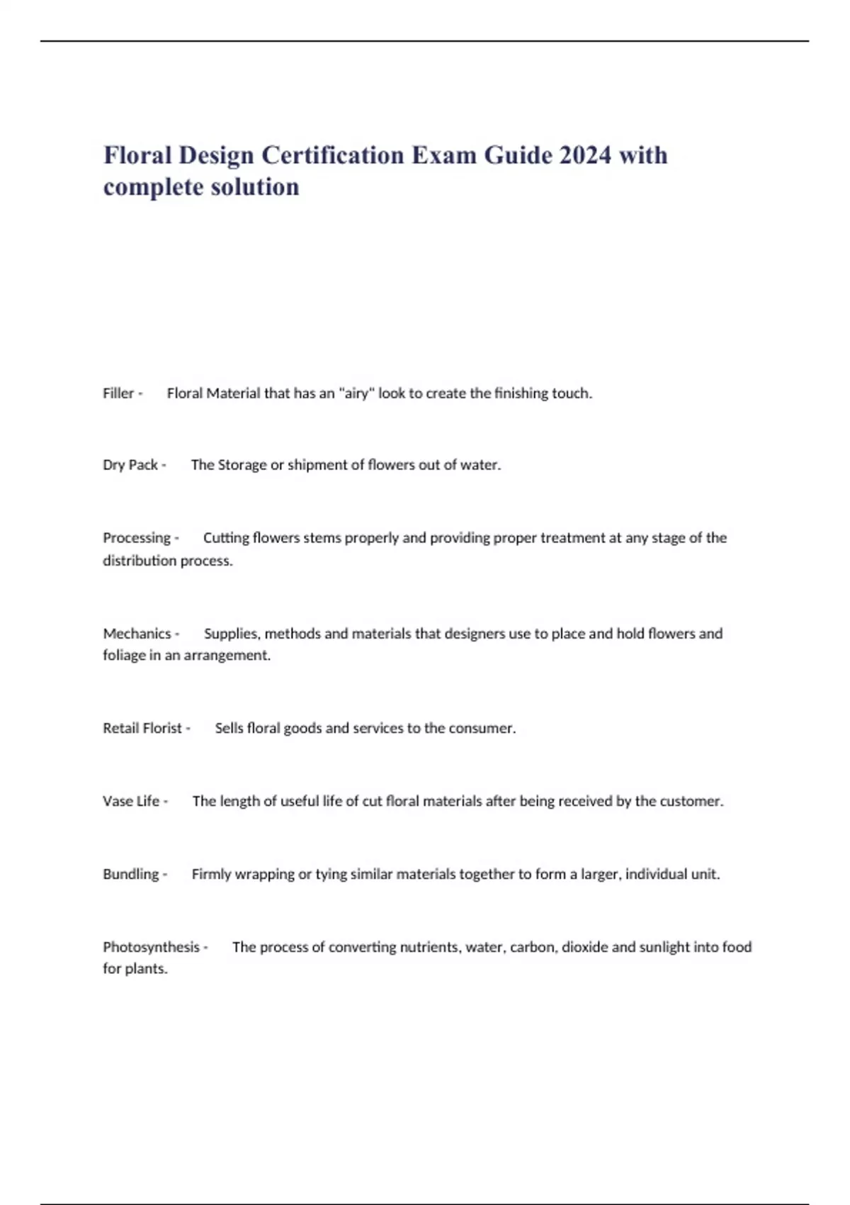 Filler - Floral Material that has an "airy" look to create the finishing touch. Dry Pack - The Storage or shipment of flowers out of water. Processing - Cutting flowers stems properly and providing proper treatment at any stage of the distribution process. Mechanics - Supplies, methods and materials that designers use to place and hold flowers and foliage in an arrangement. Retail Florist - Sells floral goods and services to the consumer. Vase Life - The length of useful life of cut floral materials after being received by the customer. Bundling - Firmly wrapping or tying similar materials together to form a larger, individual unit. Photosynthesis - The process of converting nutrients, water, carbon, dioxide and sunlight into food for plants.