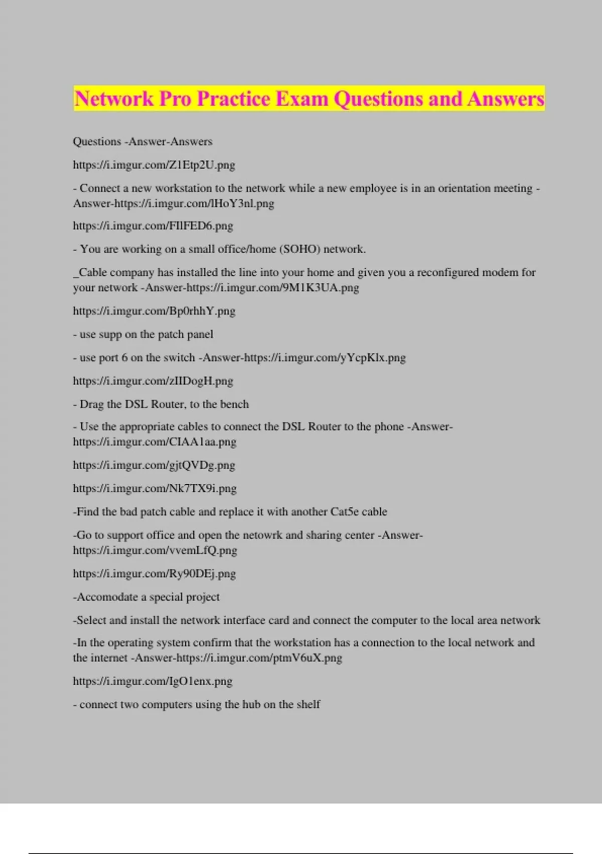 Network Pro Practice Exam Questions and Answers Questions -Answer-Answers - Connect a new workstation to the network while a new employee is in an orientation meeting - Answer- - You are working on a small office/home (SOHO) network. _Cable company has installed the line into your home and given you a reconfigured modem for your network -Answer- - use supp on the patch panel - use port 6 on the switch -Answer- - Drag the DSL Router, to the bench - Use the appropriate cables to connect the DSL Router to the phone -Answer- -Find the bad patch cable and replace it with another Cat5e cable -Go to support office and open the netowrk and sharing center -Answer- -Accomodate a special project -Select and install the network interface card and connect the computer to the local area network -In the operating system confirm that the workstation has a connection to the local network and the internet -Answer- - connect two computers using the hub on the shelf