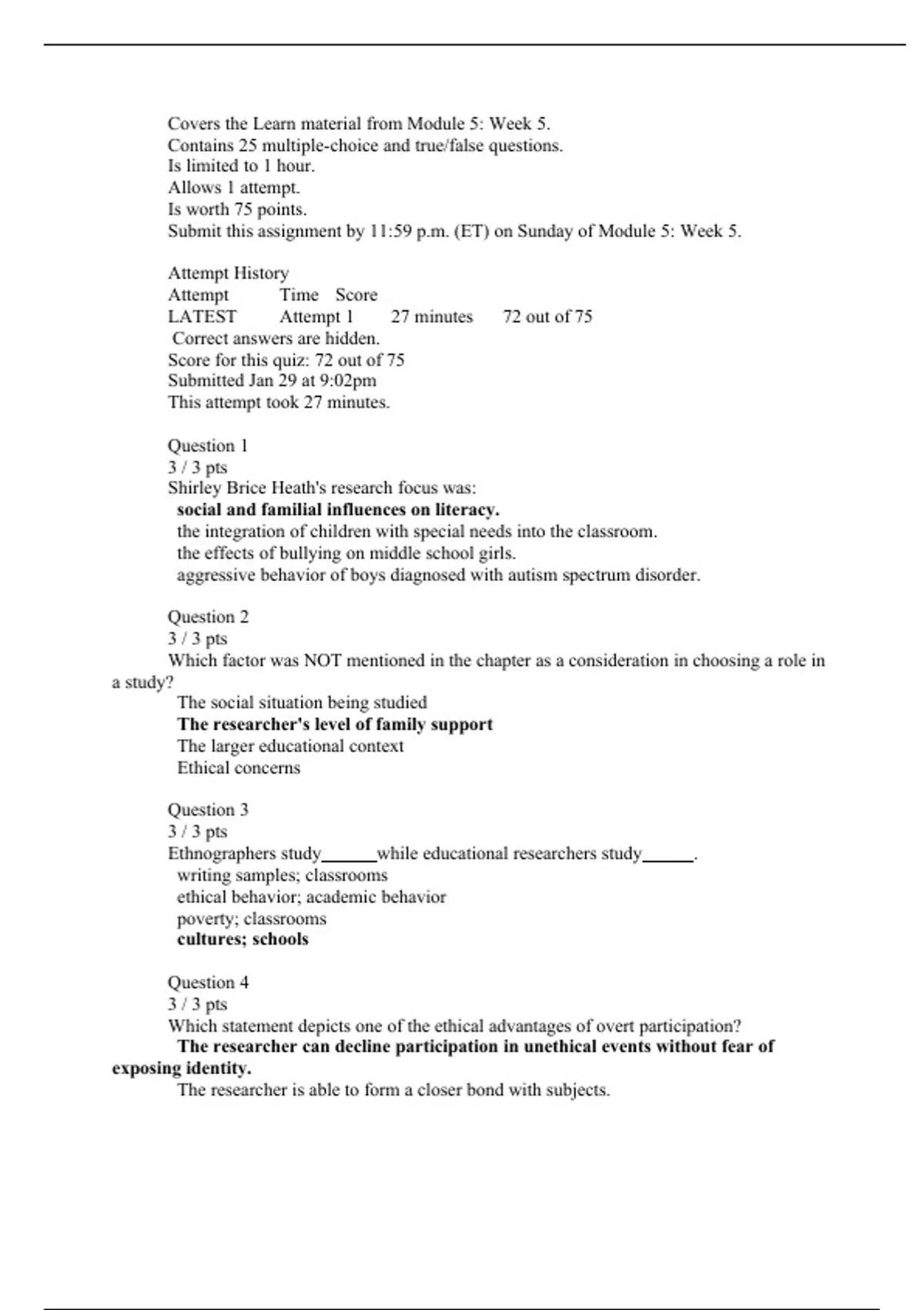 Covers the Learn material from Module 5: Week 5. Contains 25 multiple-choice and true/false questions. Is limited to 1 hour. Allows 1 attempt. Is worth 75 points. Submit this assignment by 11:59 p.m. (ET) on Sunday of Module 5: Week 5. Attempt History Attempt Time Score LATEST Attempt 1 27 minutes 72 out of 75 Correct answers are hidden. Score for this quiz: 72 out of 75 Submitted Jan 29 at 9:02pm This attempt took 27 minutes. Question 1 3 / 3 pts Shirley Brice Heath's research focus was: social and familial influences on literacy. the integration of children with special needs into the classroom. the effects of bullying on middle school girls. aggressive behavior of boys diagnosed with autism spectrum disorder. Question 2 3 / 3 pts Which factor was NOT mentioned in the chapter as a consideration in choosing a role in a study? The social situation being studied The researcher's level of family support The larger educational context Ethical concerns Question 3 3 / 3 pts Ethnographers study _____ while educational researchers study _____. writing samples; classrooms ethical behavior; academic behavior poverty; classrooms cultures; schools Question 4 3 / 3 pts Which statement depicts one of the ethical advantages of overt participation? The researcher can decline participation in unethical events without fear of exposing identity. The researcher is able to form a closer bond with subjects.