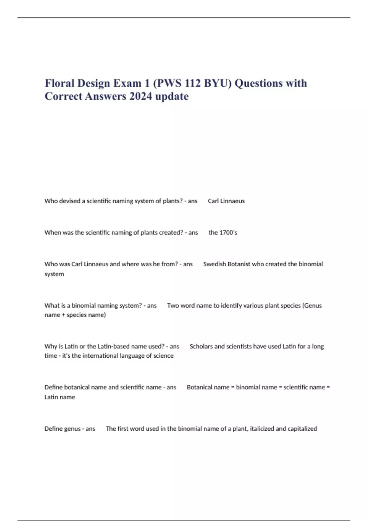Floral Design Exam 1 (PWS 112 BYU) Questions with Correct Answers 2024 update