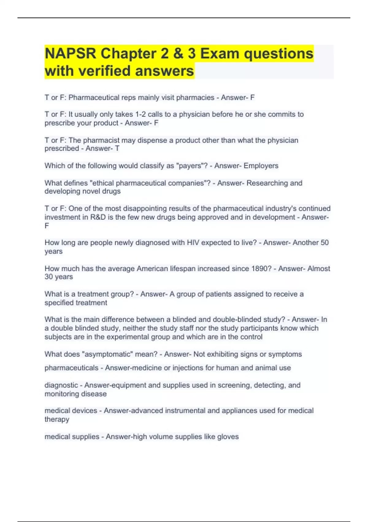 T or F: Pharmaceutical reps mainly visit pharmacies - Answer- F T or F: It usually only takes 1-2 calls to a physician before he or she commits to prescribe your product - Answer- F T or F: The pharmacist may dispense a product other than what the physician prescribed - Answer- T Which of the following would classify as "payers"? - Answer- Employers What defines "ethical pharmaceutical companies"? - Answer- Researching and developing novel drugs T or F: One of the most disappointing results of the pharmaceutical industry's continued investment in R&D is the few new drugs being approved and in development - Answer- F How long are people newly diagnosed with HIV expected to live? - Answer- Another 50 years How much has the average American lifespan increased since 1890? - Answer- Almost 30 years What is a treatment group? - Answer- A group of patients assigned to receive a specified treatment What is the main difference between a blinded and double-blinded study? - Answer- In a double blinded study, neither the study staff nor the study participants know which subjects are in the experimental group and which are in the control What does "asymptomatic" mean? - Answer- Not exhibiting signs or symptoms pharmaceuticals - Answer-medicine or injections for human and animal use diagnostic - Answer-equipment and supplies used in screening, detecting, and monitoring disease medical devices - Answer-advanced instrumental and appliances used for medical therapy medical supplies - Answer-high volume supplies like gloves