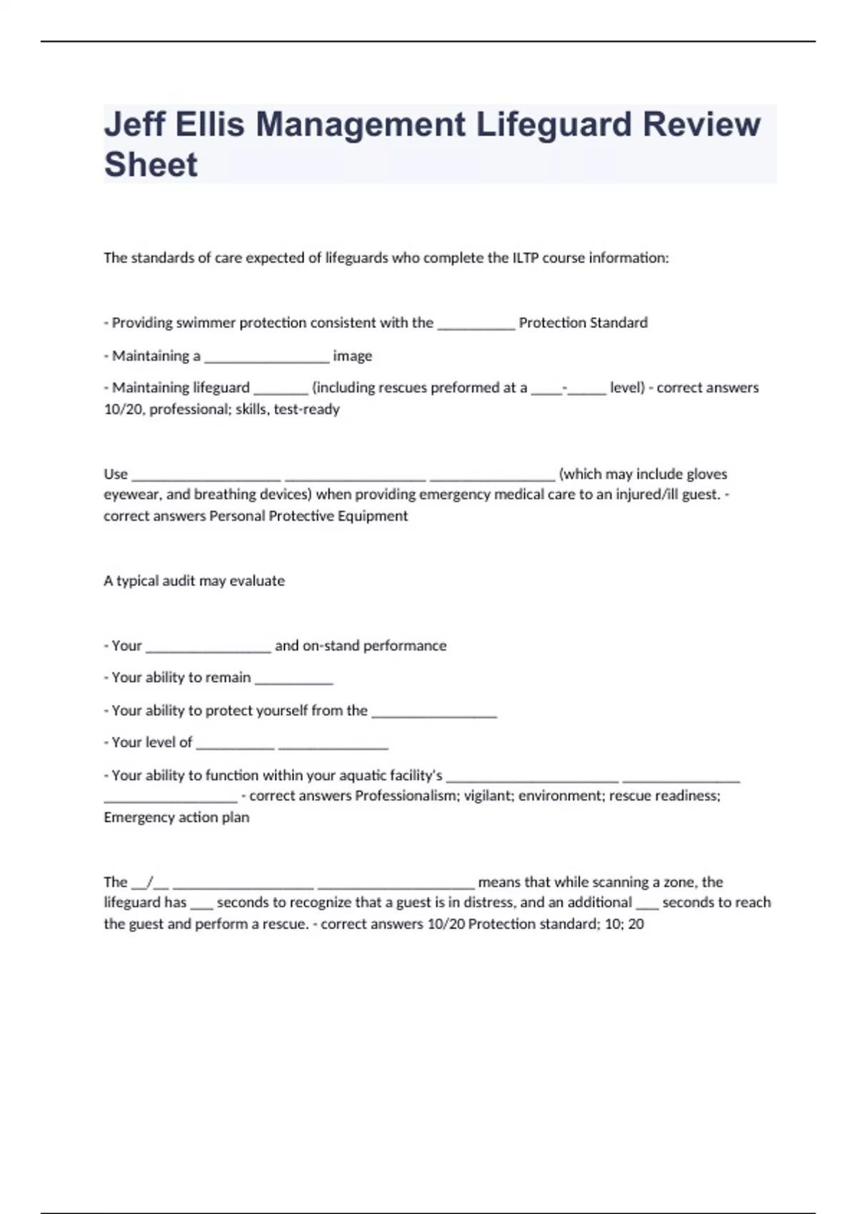 Jeff Ellis Management Lifeguard Review SheetThe standards of care expected of lifeguards who complete the ILTP course information: - Providing swimmer protection consistent with the __________ Protection Standard - Maintaining a ________________ image - Maintaining lifeguard _______ (including rescues preformed at a ____-_____ level) - correct answers 10/20, professional; skills, test-ready Use ___________________ __________________ ________________ (which may include gloves eyewear, and breathing devices) when providing emergency medical care to an injured/ill guest. - correct answers Personal Protective Equipment A typical audit may evaluate - Your ________________ and on-stand performance - Your ability to remain __________ - Your ability to protect yourself from the ________________ - Your level of __________ ______________ - Your ability to function within your aquatic facility's ______________________ _______________ _________________ - correct answers Professionalism; vigilant; environment; rescue readiness; Emergency action plan The __/__ __________________ ____________________ means that while scanning a zone, the lifeguard has ___ seconds to recognize that a guest is in distress, and an additional ___ seconds to reach the guest and perform a rescue. - correct answers 10/20 Protection standard; 10; 20