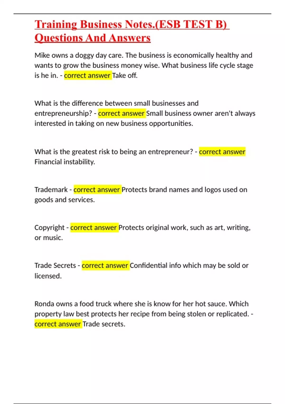 Training Business Notes.(ESB TEST B) Questions And Answers