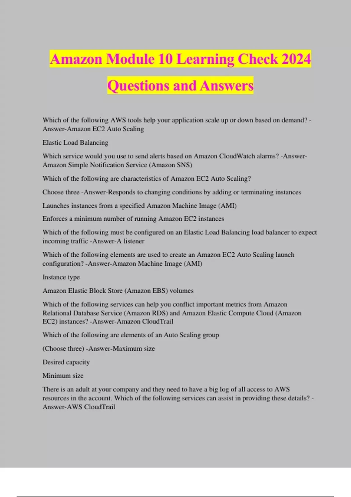 Amazon Module 10 Learning Check 2024 Questions and Answers Which of the following AWS tools help your application scale up or down based on demand? - Answer-Amazon EC2 Auto Scaling Elastic Load Balancing Which service would you use to send alerts based on Amazon CloudWatch alarms? -Answer- Amazon Simple Notification Service (Amazon SNS) Which of the following are characteristics of Amazon EC2 Auto Scaling? Choose three -Answer-Responds to changing conditions by adding or terminating instances Launches instances from a specified Amazon Machine Image (AMI) Enforces a minimum number of running Amazon EC2 instances Which of the following must be configured on an Elastic Load Balancing load balancer to expect incoming traffic -Answer-A listener Which of the following elements are used to create an Amazon EC2 Auto Scaling launch configuration? -Answer-Amazon Machine Image (AMI)