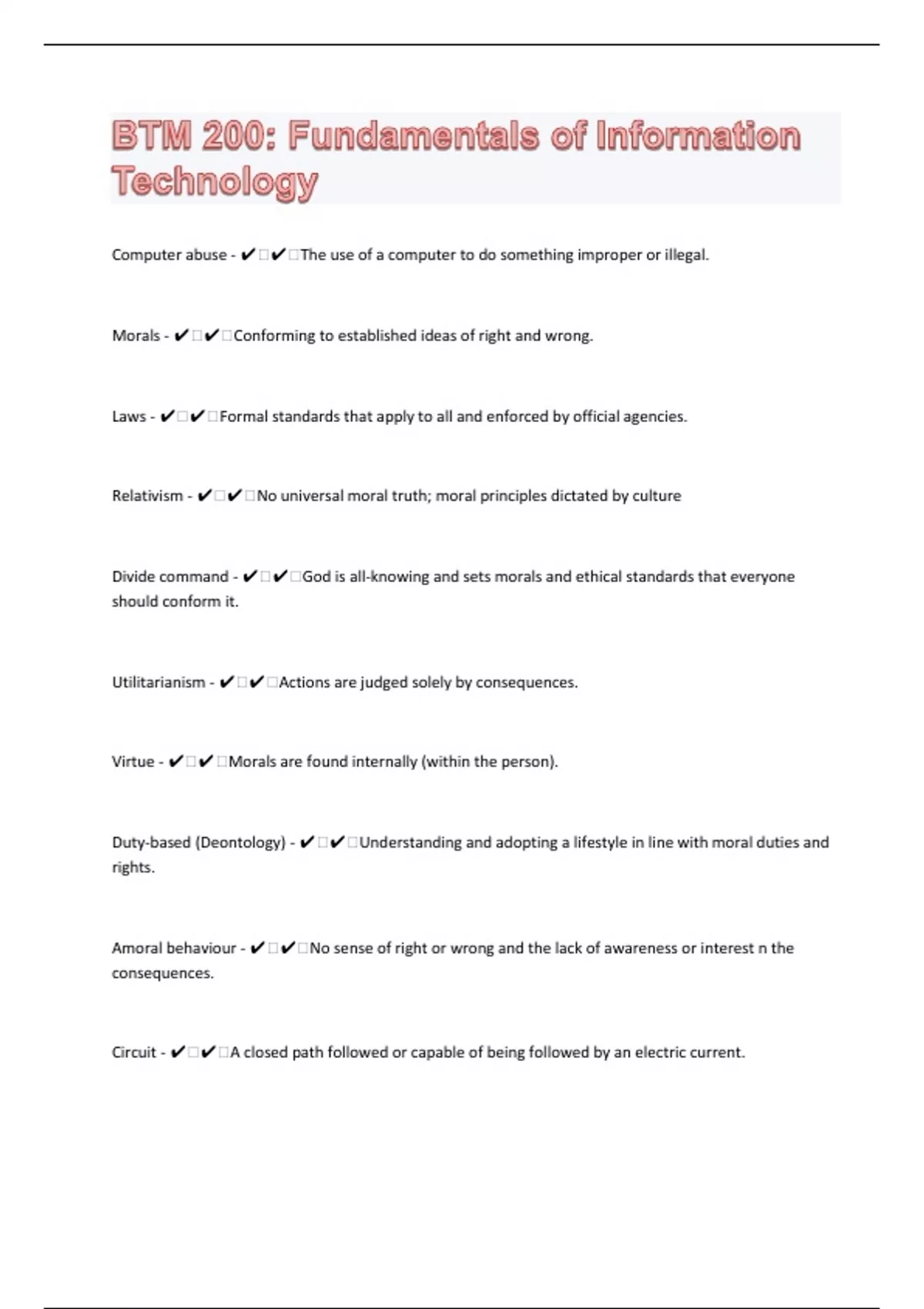 Computer abuse - ️️The use of a computer to do something improper or illegal. Morals - ️️Conforming to established ideas of right and wrong. Laws - ️️Formal standards that apply to all and enforced by official agencies. Relativism - ️️No universal moral truth; moral principles dictated by culture Divide command - ️️God is all-knowing and sets morals and ethical standards that everyone should conform it. Utilitarianism - ️️Actions are judged solely by consequences. Virtue - ️️Morals are found internally (within the person). Duty-based (Deontology) - ️️Understanding and adopting a lifestyle in line with moral duties and rights. Amoral behaviour - ️️No sense of right or wrong and the lack of awareness or interest n the consequences. Circuit - ️️A closed path followed or capable of being followed by an electric current.