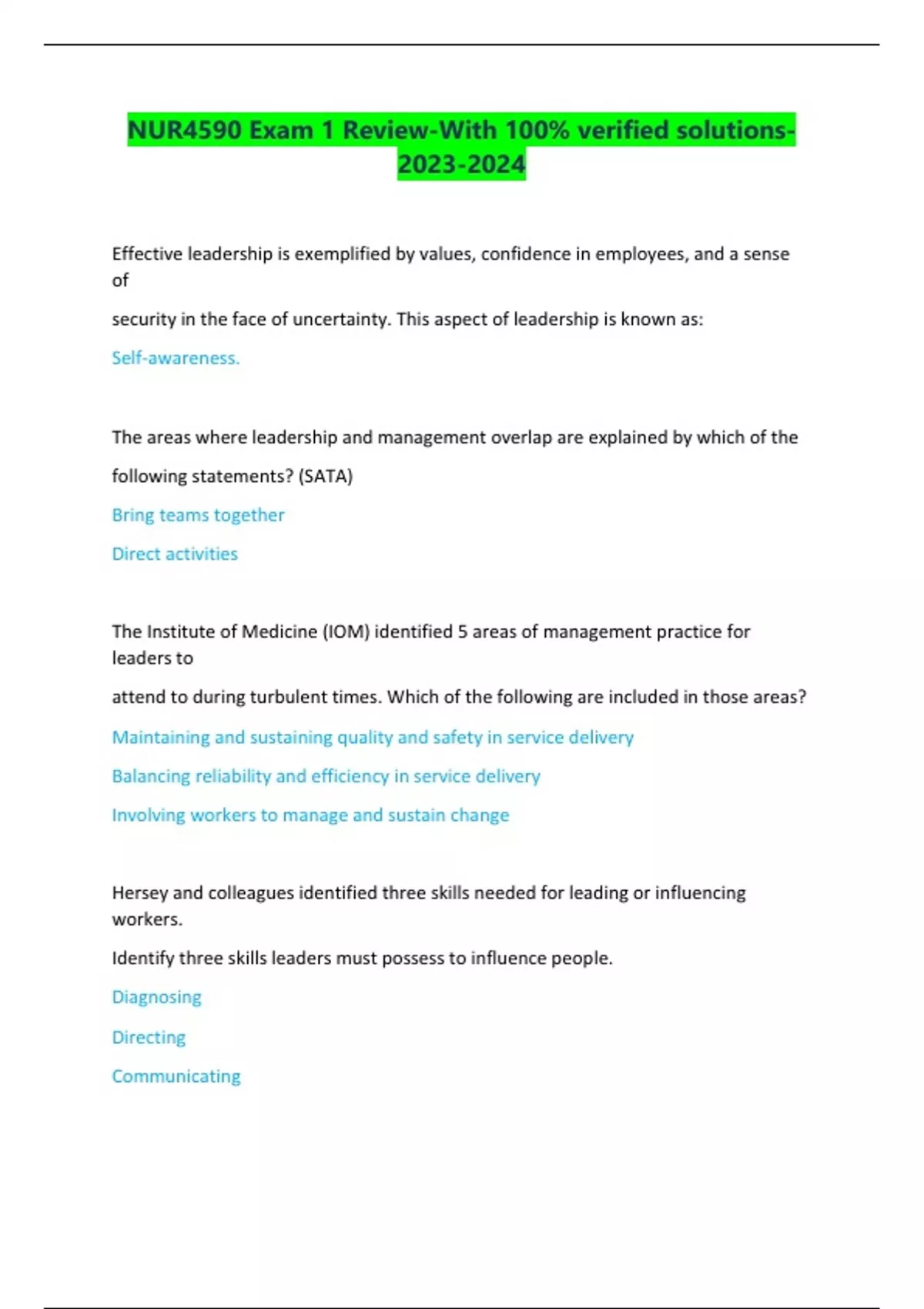 NUR4590 Exam 1 Review-With 100% verified solutions-