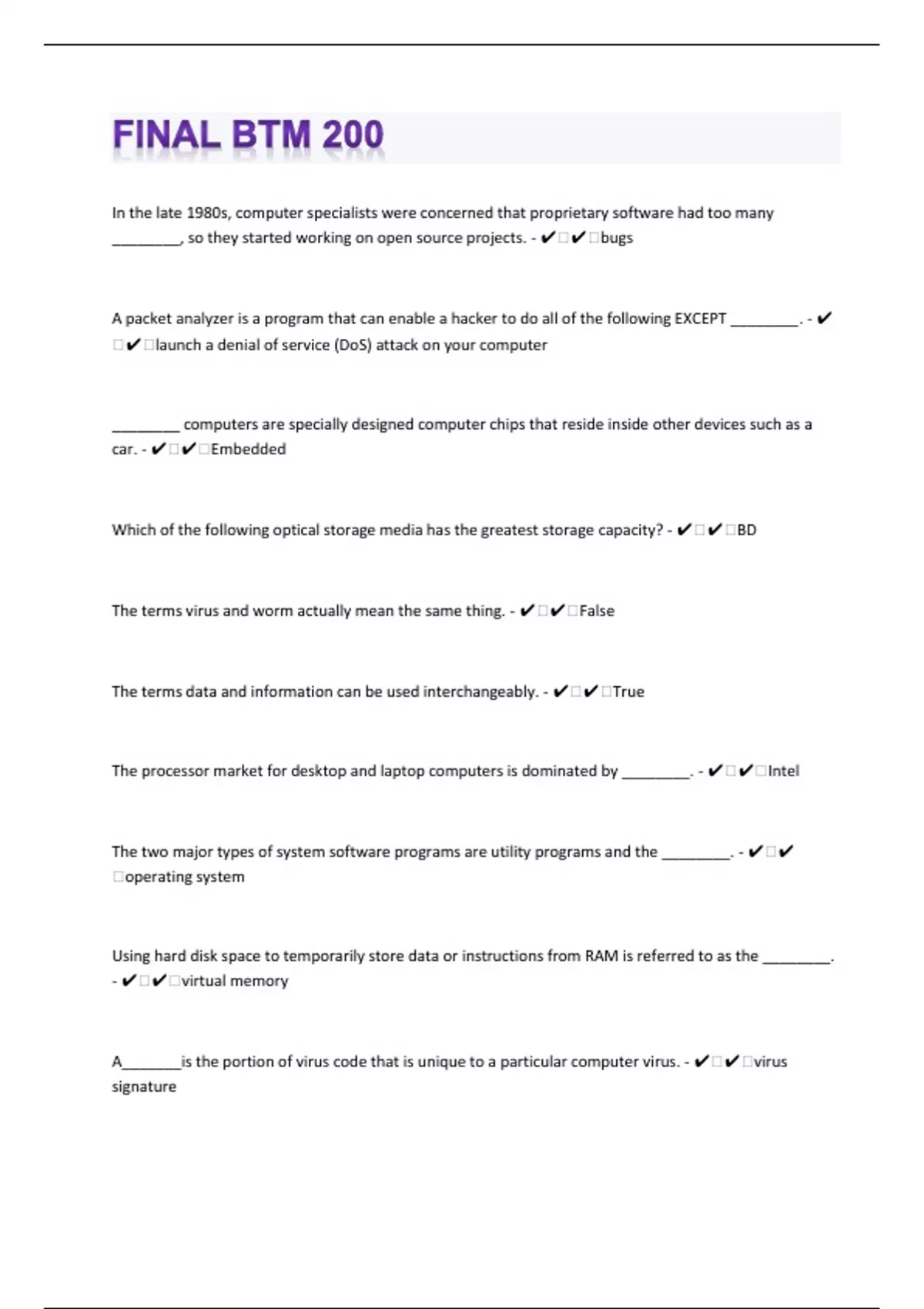 In the late 1980s, computer specialists were concerned that proprietary software had too many ________, so they started working on open source projects. - ️️bugs A packet analyzer is a program that can enable a hacker to do all of the following EXCEPT ________. - ️️launch a denial of service (DoS) attack on your computer ________ computers are specially designed computer chips that reside inside other devices such as a car. - ️️Embedded Which of the following optical storage media has the greatest storage capacity? - ️️BD The terms virus and worm actually mean the same thing. - ️️False The terms data and information can be used interchangeably. - ️️True The processor market for desktop and laptop computers is dominated by ________. - ️️Intel The two major types of system software programs are utility programs and the ________. - ️️operating system Using hard disk space to temporarily store data or instructions from RAM is referred to as the ________. - ️️virtual memory A_______is the portion of virus code that is unique to a particular computer virus. - ️️virus signature