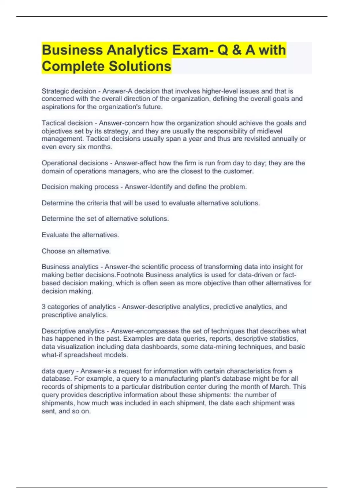 Strategic decision - Answer-A decision that involves higher-level issues and that is concerned with the overall direction of the organization, defining the overall goals and aspirations for the organization's future. Tactical decision - Answer-concern how the organization should achieve the goals and objectives set by its strategy, and they are usually the responsibility of midlevel management. Tactical decisions usually span a year and thus are revisited annually or even every six months. Operational decisions - Answer-affect how the firm is run from day to day; they are the domain of operations managers, who are the closest to the customer. Decision making process - Answer-Identify and define the problem. Determine the criteria that will be used to evaluate alternative solutions. Determine the set of alternative solutions. Evaluate the alternatives. Choose an alternative. Business analytics - Answer-the scientific process of transforming data into insight for making better decisions.Footnote Business analytics is used for data-driven or fact-based decision making, which is often seen as more objective than other alternatives for decision making. 3 categories of analytics - Answer-descriptive analytics, predictive analytics, and prescriptive analytics. Descriptive analytics - Answer-encompasses the set of techniques that describes what has happened in the past. Examples are data queries, reports, descriptive statistics, data visualization including data dashboards, some data-mining techniques, and basic what-if spreadsheet models. data query - Answer-is a request for information with certain characteristics from a database. For example, a query to a manufacturing plant's database might be for all records of shipments to a particular distribution center during the month of March. This query provides descriptive information about these shipments: the number of shipments, how much was included in each shipment, the date each shipment was sent, and so on.