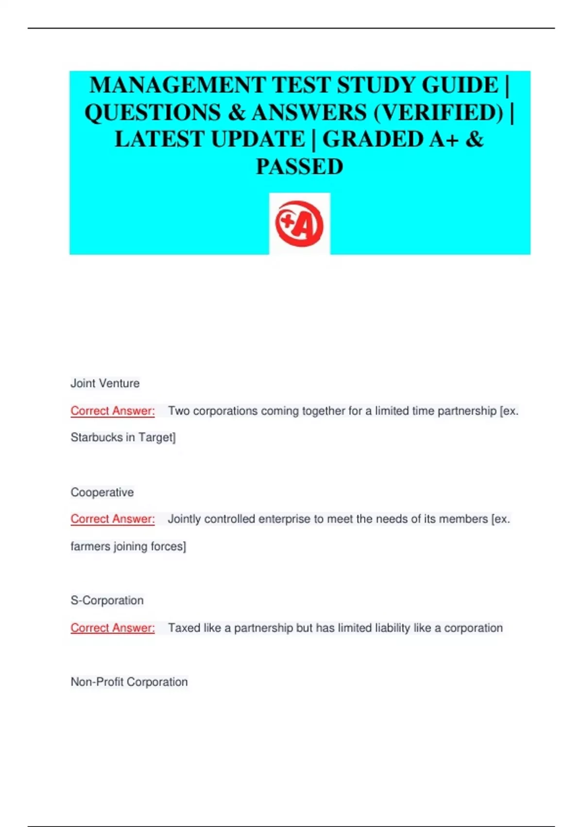 MANAGEMENT TEST STUDY GUIDE | QUESTIONS & ANSWERS (VERIFIED) | LATEST UPDATE | GRADED A+ & PASSEDMANAGEMENT TEST STUDY GUIDE | QUESTIONS & ANSWERS (VERIFIED) | LATEST UPDATE | GRADED A+ & PASSEDMANAGEMENT TEST STUDY GUIDE | QUESTIONS & ANSWERS (VERIFIED) | LATEST UPDATE | GRADED A+ & PASSED