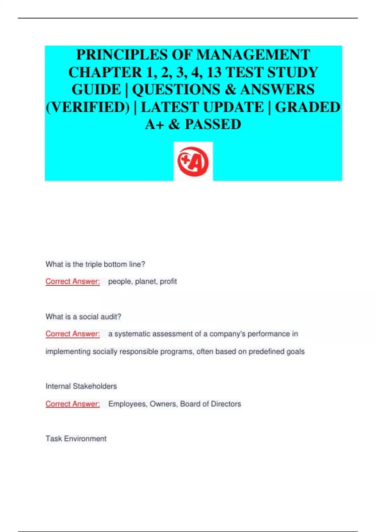 PRINCIPLES OF MANAGEMENT CHAPTER 1, 2, 3, 4, 13 TEST STUDY GUIDE | QUESTIONS & ANSWERS (VERIFIED) | LATEST UPDATE | GRADED A+ & PASSEDPRINCIPLES OF MANAGEMENT CHAPTER 1, 2, 3, 4, 13 TEST STUDY GUIDE | QUESTIONS & ANSWERS (VERIFIED) | LATEST UPDATE | GRADED A+ & PASSEDPRINCIPLES OF MANAGEMENT CHAPTER 1, 2, 3, 4, 13 TEST STUDY GUIDE | QUESTIONS & ANSWERS (VERIFIED) | LATEST UPDATE | GRADED A+ & PASSED