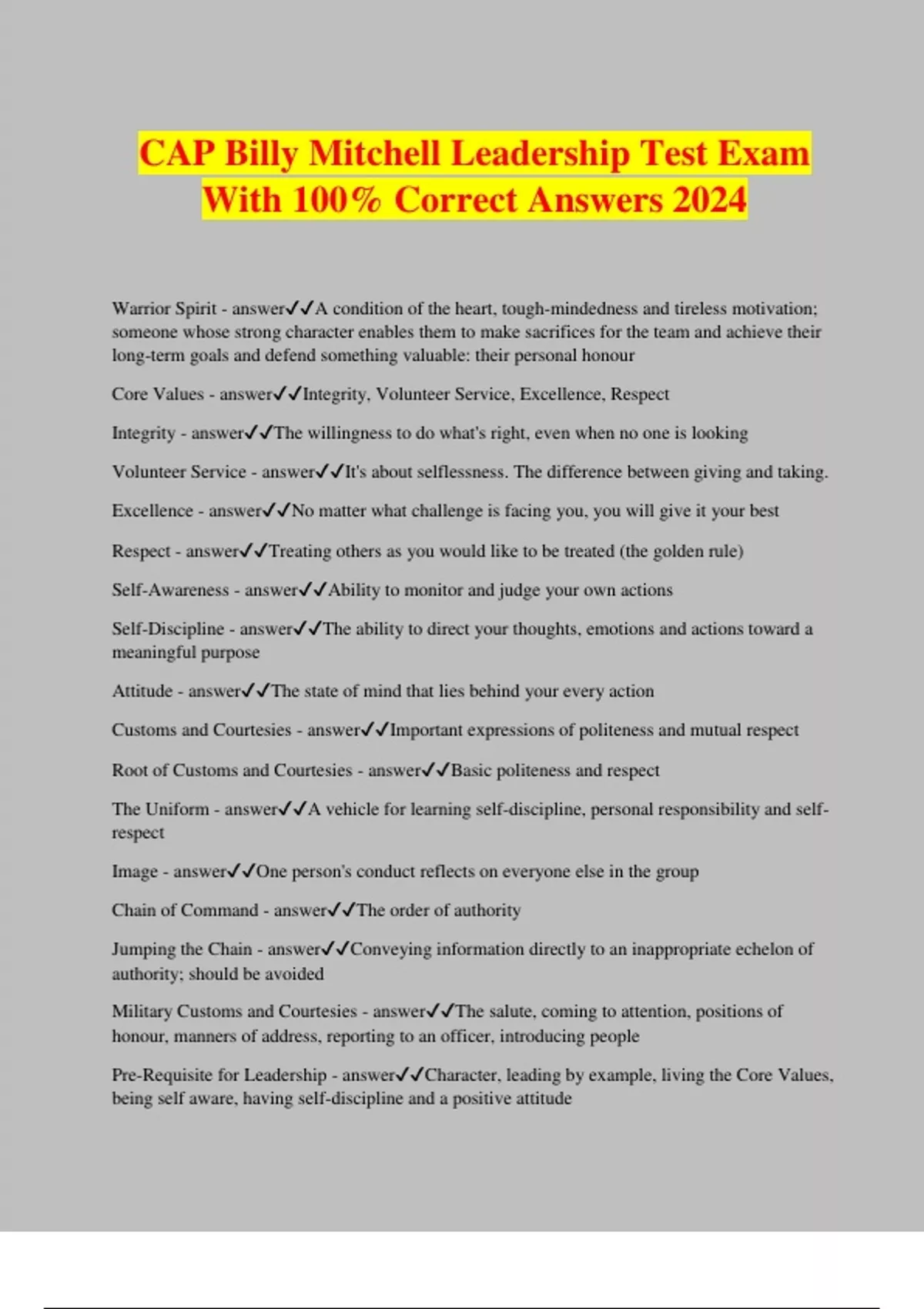 CAP Billy Mitchell Leadership Test Exam With 100% Correct Answers 2024