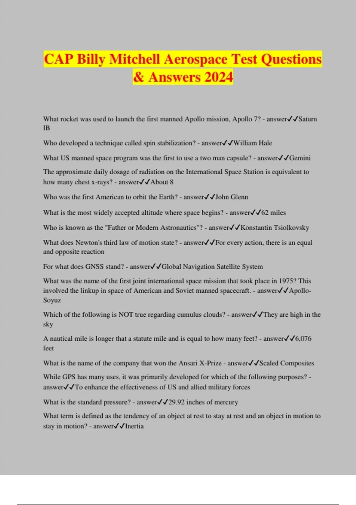 CAP Billy Mitchell Aerospace Test Questions & Answers 2024 What rocket was used to launch the first manned Apollo mission, Apollo 7? - answerSaturn IB Who developed a technique called spin stabilization? - answerWilliam Hale What US manned space program was the first to use a two man capsule? - answerGemini The approximate daily dosage of radiation on the International Space Station is equivalent to how many chest x-rays? - answerAbout 8 Who was the first American to orbit the Earth? - answerJohn Glenn What is the most widely accepted altitude where space begins? - answer62 miles Who is known as the "Father or Modern Astronautics"? - answerKonstantin Tsiolkovsky What does Newton's third law of motion state? - answerFor every action, there is an equal and opposite reaction For what does GNSS stand? - answerGlobal Navigation Satellite System What was the name of the first joint international space mission that took place in 1975? This involved the linkup in space of American and Soviet manned spacecraft. - answerApollo- Soyuz Which of the following is NOT true regarding cumulus clouds? - answerThey are high in the sky A nautical mile is longer that a statute mile and is equal to how many feet? - answer6,076 feet What is the name of the company that won the Ansari X-Prize - answerScaled Composites While GPS has many uses, it was primarily developed for which of the following purposes? - answerTo enhance the effectiveness of US and allied military forces What is the standard pressure? - answer29.92 inches of mercury What term is defined as the tendency of an object at rest to stay at rest and an object in motion to stay in motion? - answerInerti