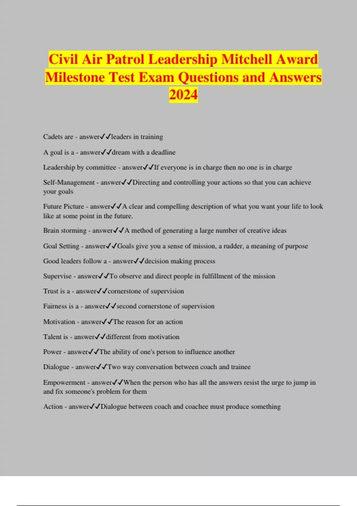 Civil Air Patrol Leadership Mitchell Award Milestone Test Exam Questions and Answers 2024 Cadets are - answerleaders in training A goal is a - answerdream with a deadline Leadership by committee - answerIf everyone is in charge then no one is in charge Self-Management - answerDirecting and controlling your actions so that you can achieve your goals Future Picture - answerA clear and compelling description of what you want your life to look like at some point in the future. Brain storming - answerA method of generating a large number of creative ideas Goal Setting - answerGoals give you a sense of mission, a rudder, a meaning of purpose Good leaders follow a - answerdecision making process Supervise - answerTo observe and direct people in fulfillment of the mission Trust is a - answercornerstone of supervision Fairness is a - answersecond cornerstone of supervision Motivation - answerThe reason for an action Talent is - answerdifferent from motivation Power - answerThe ability of one's person to influence another Dialogue - answerTwo way conversation between coach and trainee Empowerment - answerWhen the person who has all the answers resist the urge to jump in and fix someone's problem for them Action - answerDialogue between coach and coachee must produce something improvement - answerUltimately, the goal of good coaching is to help the coachee reach a higher level of effectiveness Constructive Discipline - answera learning process that provides an opportunity for positive growth Leaders focus on - answerperformance Attitude - answerThe state of mind that lie