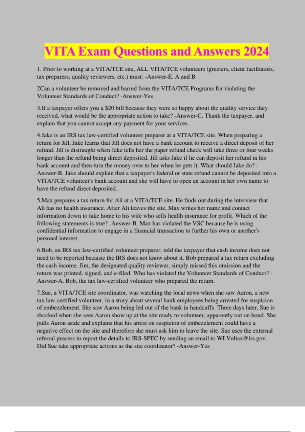 VITA Exam Questions and Answers 2024 1. Prior to working at a VITA/TCE site, ALL VITA/TCE volunteers (greeters, client facilitators, tax preparers, quality reviewers, etc.) must: -Answer-E. A and B 2Can a volunteer be removed and barred from the VITA/TCE Programs for violating the Volunteer Standards of Conduct? -Answer-Yes 3.If a taxpayer offers you a $20 bill because they were so happy about the quality service they received, what would be the appropriate action to take? -Answer-C. Thank the taxpayer, and explain that you cannot accept any payment for your services. 4.Jake is an IRS tax law-certified volunteer preparer at a VITA/TCE site. When preparing a return for Jill, Jake learns that Jill does not have a bank account to receive a direct deposit of her refund. Jill is distraught when Jake tells her the paper refund check will take three or four weeks longer than the refund being direct deposited. Jill asks Jake if he can deposit her refund in his bank account and then turn the money over to her when he gets it. What should Jake do? - Answer-B. Jake should explain that a taxpayer's federal or state refund cannot be deposited into a VITA/TCE volunteer's bank account and she will have to open an account in her own name to have the refund direct deposited. 5.Max prepares a tax return for Ali at a VITA/TCE site. He finds out during the interview that Ali has no health insurance. After Ali leaves the site, Max writes her name and contact information down to take home to his wife who sells health insurance for profit. Which of the following statements is true? -Answer-B. Max has violated the VSC because he is using confidential information to engage in a financial transaction to further his own or another's personal interest.
