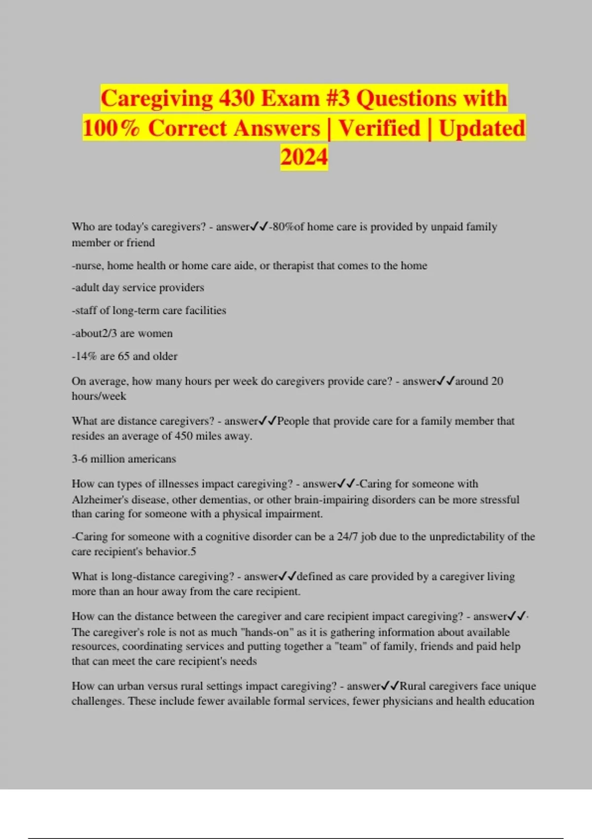 Caregiving 430 Exam #3 Questions with 100% Correct Answers | Verified | Updated 2024 Who are today's caregivers? - answer-80%of home care is provided by unpaid family member or friend -nurse, home health or home care aide, or therapist that comes to the home -adult day service providers -staff of long-term care facilities -about2/3 are women -14% are 65 and older On average, how many hours per week do caregivers provide care? - answeraround 20 hours/week What are distance caregivers? - answerPeople that provide care for a family member that resides an average of 450 miles away. 3-6 million americans How can types of illnesses impact caregiving? - answer-Caring for someone with Alzheimer's disease, other dementias, or other brain-impairing disorders can be more stressful than caring for someone with a physical impairment. -Caring for someone with a cognitive disorder can be a 24/7 job due to the unpredictability of the care recipient's behavior.5 What is long-distance caregiving? - answerdefined as care provided by a caregiver living more than an hour away from the care recipient. How can the distance between the caregiver and care recipient impact caregiving? - answer· The caregiver's role is not as much "hands-on" as it is gathering information about available resources, coordinating services and putting together a "team" of family, friends and paid help that can meet the care recipient's needs How can urban versus rural settings impact caregiving? - answerRural caregivers face unique challenges. These include fewer available formal services, fewer physicians and health education services, transportation difficulties, weather problems in winter, geographic distance and isolation. How can different cultural approaches impact caregiving? - answer-There are many histories, traditions and rituals to caregiving. -In many cultures, there are family expectations about the caregiving roles of adult children; this is especially true in cultures where daughters or daughters-in-law are expected to assume the primary caregiver role for aging parents. In the U.S, how are ethnic caregivers compared to white caregivers? - answerStudies show that ethnic minority caregivers provide more care than their white counterparts and report worse physical health than white caregivers What is the average age of caregivers? - answerMany caregivers of older people are themselves elderly. Of those caring for someone aged 65+, the average age of caregivers is 63 years with one third of these caregivers in fair to poor health. How long can caregiving last? - answerless tha