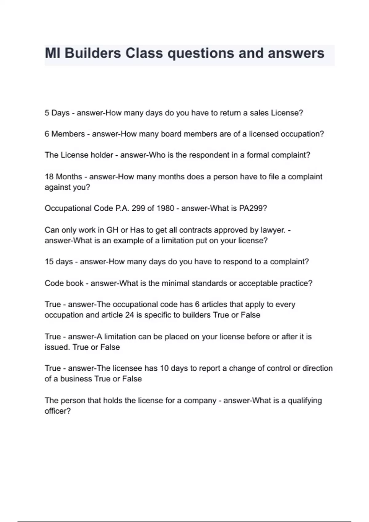 MI Builders Class questions and answers