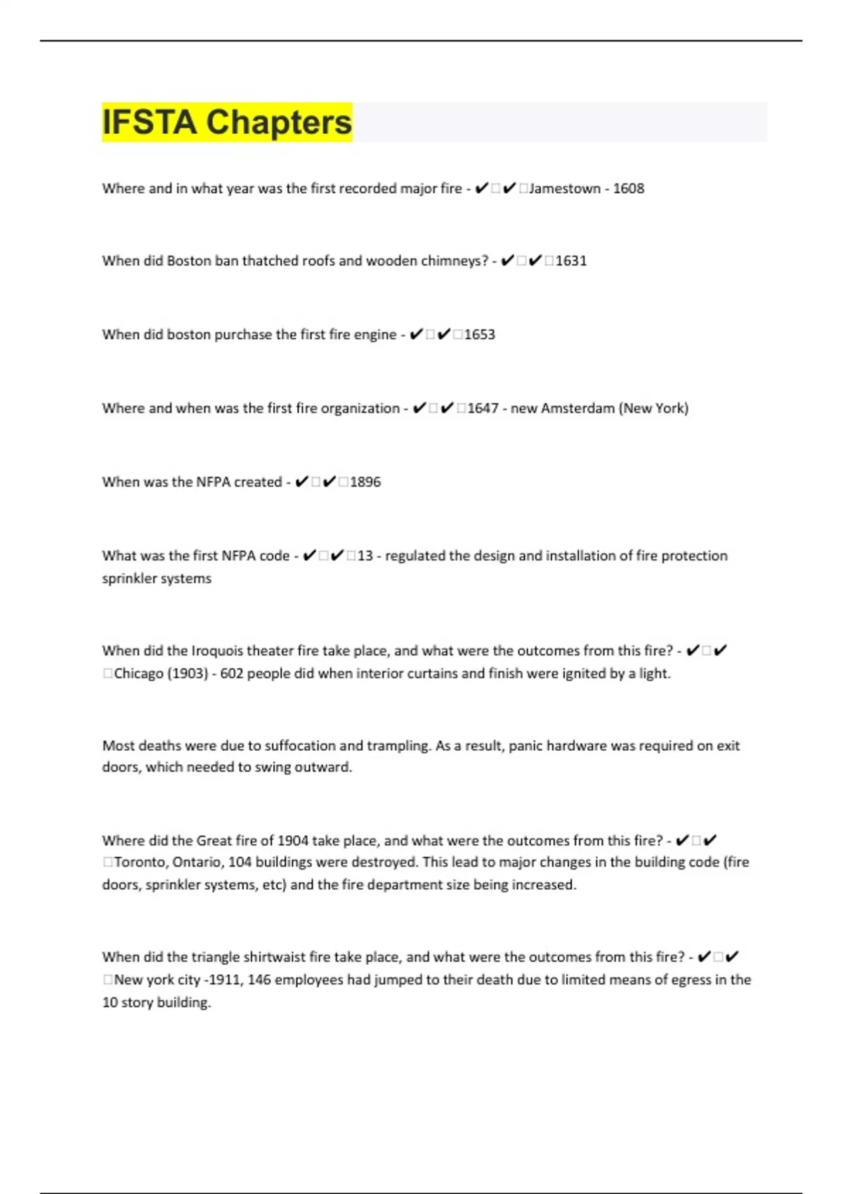 Where and in what year was the first recorded major fire - ️️Jamestown - 1608 When did Boston ban thatched roofs and wooden chimneys? - ️️1631 When did boston purchase the first fire engine - ️️1653 Where and when was the first fire organization - ️️1647 - new Amsterdam (New York) When was the NFPA created - ️️1896 What was the first NFPA code - ️️13 - regulated the design and installation of fire protection sprinkler systems When did the Iroquois theater fire take place, and what were the outcomes from this fire? - ️️Chicago (1903) - 602 people did when interior curtains and finish were ignited by a light. Most deaths were due to suffocation and trampling. As a result, panic hardware was required on exit doors, which needed to swing outward. Where did the Great fire of 1904 take place, and what were the outcomes from this fire? - ️️Toronto, Ontario, 104 buildings were destroyed. This lead to major changes in the building code (fire doors, sprinkler systems, etc) and the fire department size being increased. When did the triangle shirtwaist fire take place, and what were the outcomes from this fire? - ️️New york city -1911, 146 employees had jumped to their death due to limited means of egress in the 10 story building.