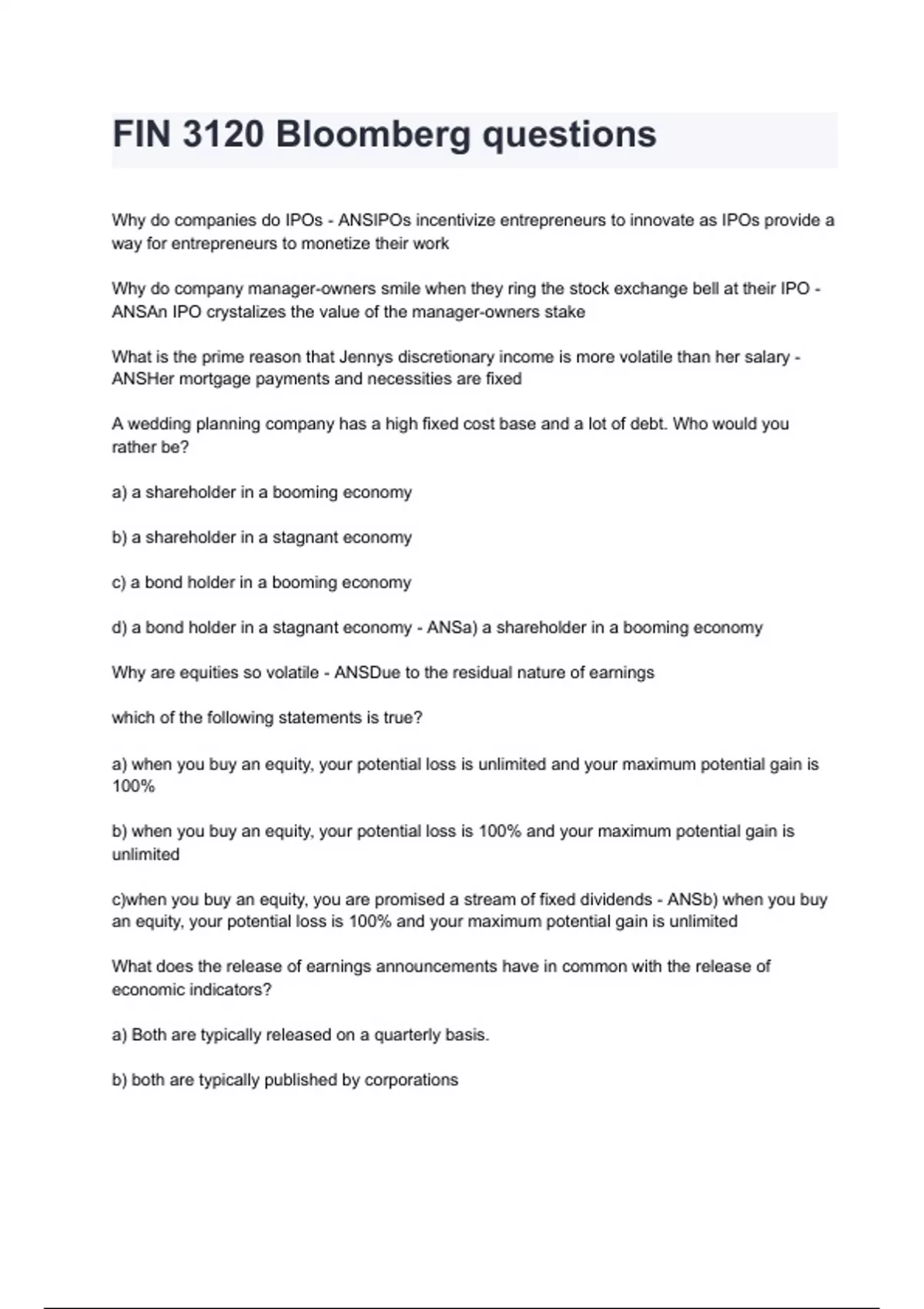 FIN 3120 Bloomberg questions 2024/2025 already graded A+