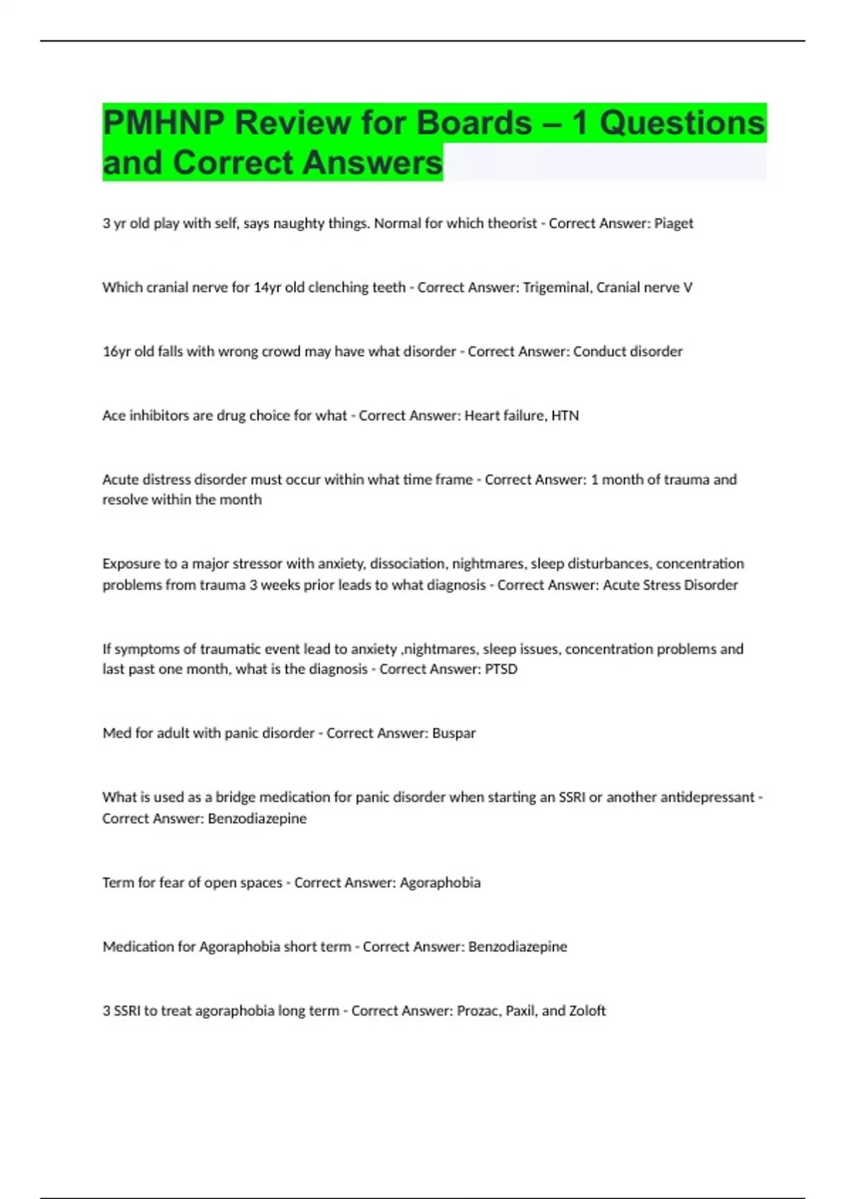 PMHNP Review for Boards – 1 Questions and Correct Answers.