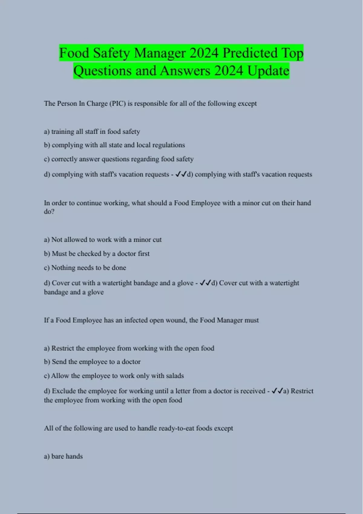 The Person In Charge (PIC) is responsible for all of the following except a) training all staff in food safety b) complying with all state and local regulations c) correctly answer questions regarding food safety d) complying with staff's vacation requests - d) complying with staff's vacation requests In order to continue working, what should a Food Employee with a minor cut on their hand do? a) Not allowed to work with a minor cut b) Must be checked by a doctor first c) Nothing needs to be done d) Cover cut with a watertight bandage and a glove - d) Cover cut with a watertight bandage and a glove If a Food Employee has an infected open wound, the Food Manager must a) Restrict the employee from working with the open food b) Send the employee to a doctor c) Allow the employee to work only with salads d) Exclude the employee for working until a letter from a doctor is received - a) Restrict the employee from working with the open food All of the following are used to handle ready-to-eat foods except