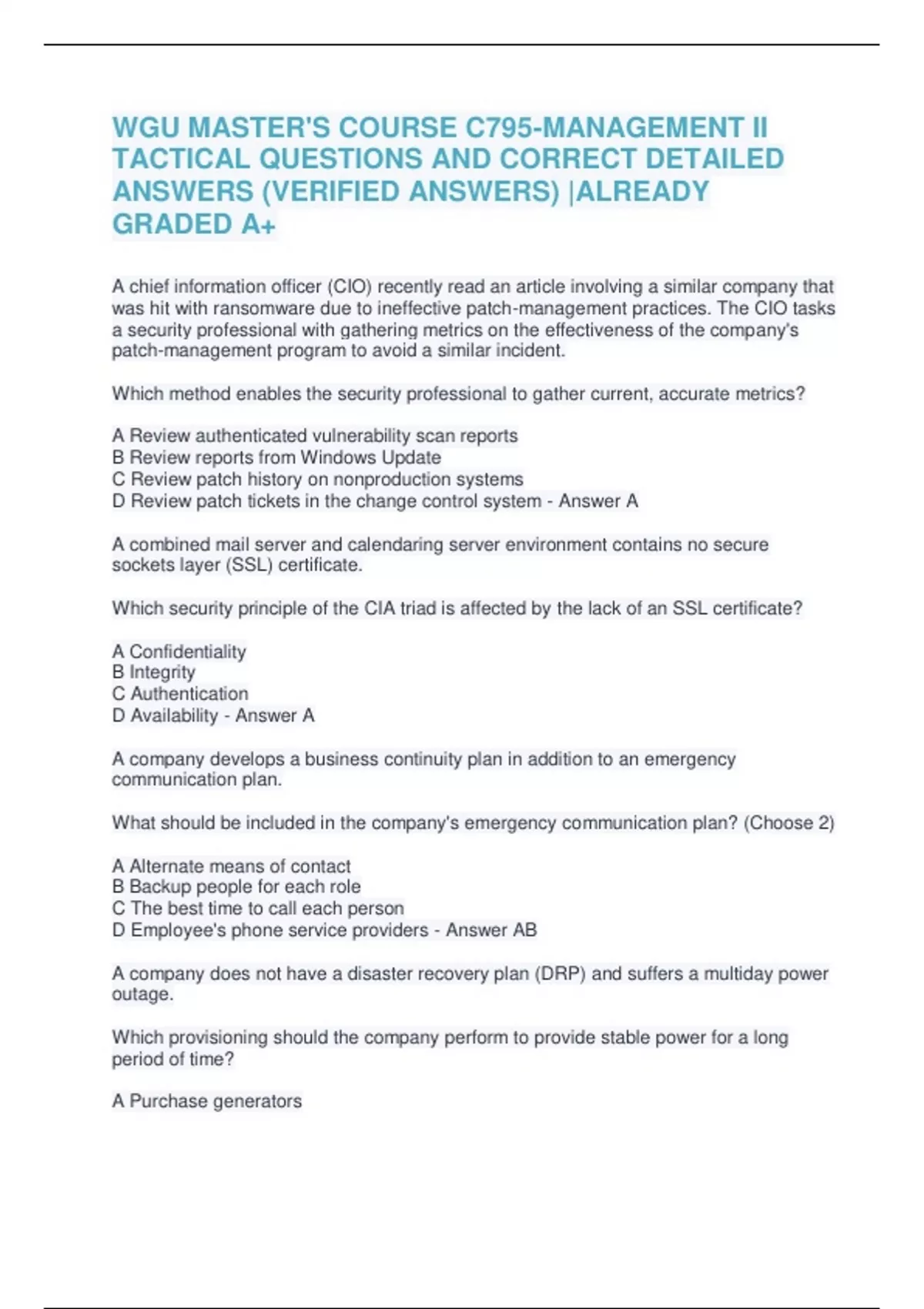 WGU MASTER'S COURSE C795-MANAGEMENT II TACTICAL QUESTIONS AND CORRECT DETAILED ANSWERS (VERIFIED ANSWERS) ALREADY GRADED A+
