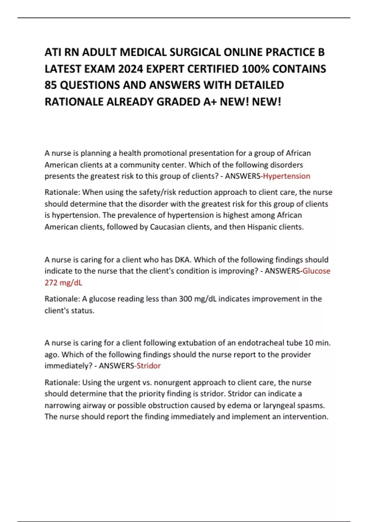 ATI RN ADULT MEDICAL SURGICAL ONLINE PRACTICE B LATEST EXAM 2024 EXPERT CERTIFIED 100% CONTAINS 85 QUESTIONS AND ANSWERS WITH DETAILED RATIONALE ALREADY GRADED A+ NEW! NEW