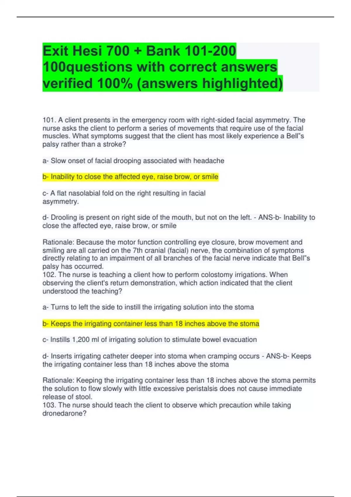 Exit Hesi 700 + Bank 101-200 100questions with correct answers verified 100% (answers highlighted) 101. A client presents in the emergency room with right-sided facial asymmetry. The nurse asks the client to perform a series of movements that require use of the facial muscles. What symptoms suggest that the client has most likely experience a Bell‟s palsy rather than a stroke? a- Slow onset of facial drooping associated with headache b- Inability to close the affected eye, raise brow, or smile c- A flat nasolabial fold on the right resulting in facial asymmetry. d- Drooling is present on right side of the mouth, but not on the left. - ANS-b- Inability to close the affected eye, raise brow, or smile Rationale: Because the motor function controlling eye closure, brow movement and smiling are all carried on the 7th cranial (facial) nerve, the combination of symptoms directly relating to an impairment of all branches of the facial nerve indicate that Bell‟s palsy has occurred. 102. The nurse is teaching a client how to perform colostomy irrigations. When observing the client's return demonstration, which action indicated that the client understood the teaching? a- Turns to left the side to instill the irrigating solution into the stoma b- Keeps the irrigating container less than 18 inches above the stoma c- Instills 1,200 ml of irrigating solution to stimulate bowel evacuation d- Inserts irrigating catheter deeper into stoma when cramping occurs - ANS-b- Keeps the irrigating container less than 18 inches above the stoma Rationale: Keeping the irrigating container less than 18 inches above the stoma permits the solution to flow slowly with little excessive peristalsis does not cause immediate release of stool. 103. The nurse should teach the client to observe which precaution while taking dronedarone? a- Stay out of direct sunlight b- Avoid grapefruits and its juice c- Reduce the use of herbal supplements d- Minimize sodium intake. - ANS-b- Avoid grapefruits and its juice Rationale: Grapefruit increase the effect of dronedarone thereby increasing the possibility of serious side effects. A does not cause a serious effect. C may potentiate lethal arrhythmias and should be avoided. D does not directly affect those taking dronedarone. 104. A client who sustained a head injury following an automobile collision is admitted to the hospital. The nurse includes the client's risk for developing increased intracranial pressure (ICP) in the plan of care. Which signs indicate to the nurse that ICP has increased? a- Increased Glasgow coma scale score b- Nuchal rigidity and papilledema c- Confusion and papilledema d- Periorbital ecchymosis. - ANS-c- Confusion and papilledema Rationale: papilledema is always an indicator of increased ICP, and confusion is usually the first sign of increased ICP. Other options do not necessarily reflect increased ICP. 105. The nurse is caring for a client receiving continuous IV fluids through a single lumen central venous catheter (CVC). Based on the CVC care bundle, which action should be completed daily to reduce the risk for infection? a- Remind staff to follow protective environment precautions b- Gently flush the catheter lumen with sterile saline solution c- Cleanse the