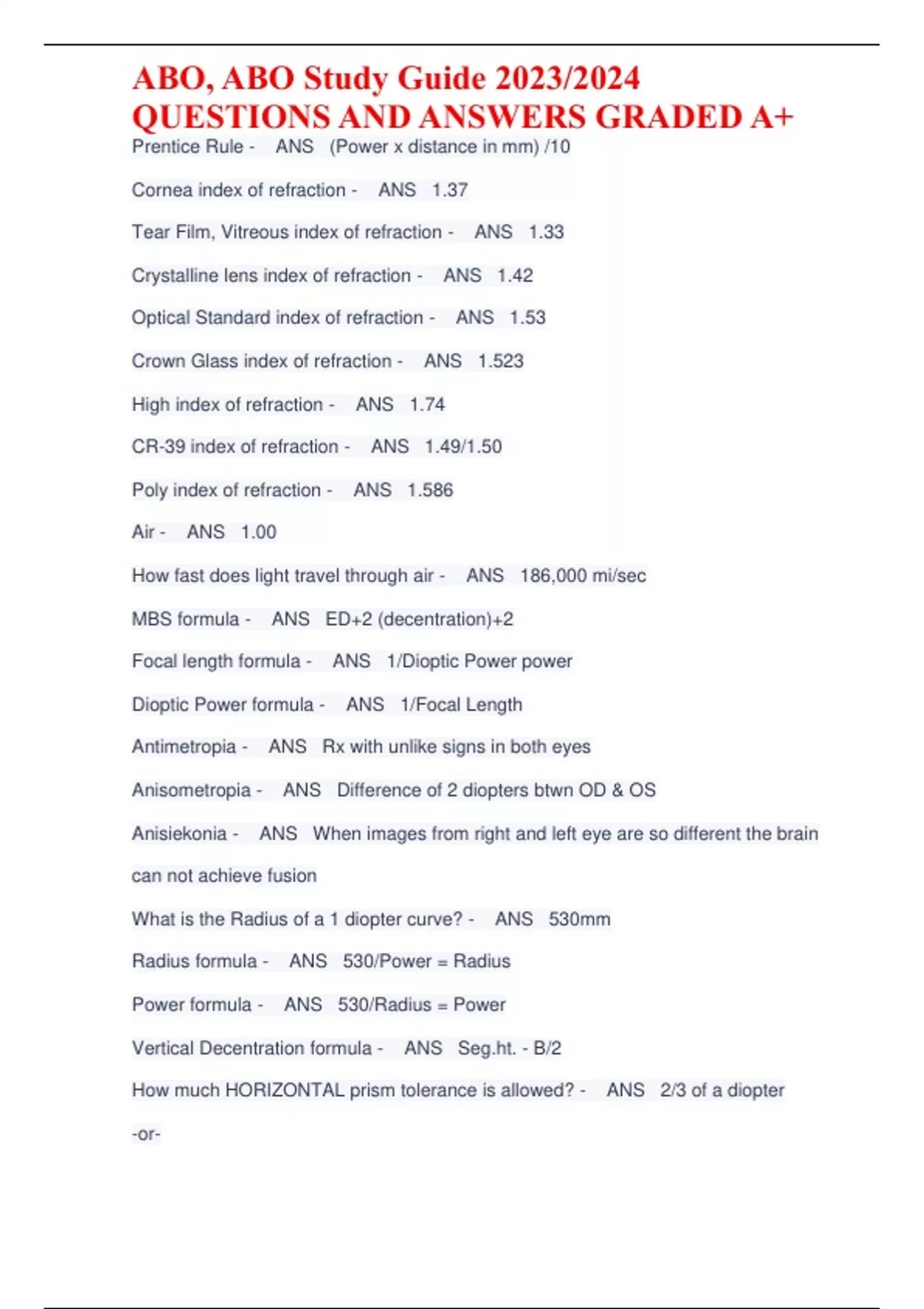 Prentice Rule - ANS (Power x distance in mm) /10 Cornea index of refraction - ANS 1.37 Tear Film, Vitreous index of refraction - ANS 1.33 Crystalline lens index of refraction - ANS 1.42 Optical Standard index of refraction - ANS 1.53 Crown Glass index of refraction - ANS 1.523 High index of refraction - ANS 1.74 CR-39 index of refraction - ANS 1.49/1.50 Poly index of refraction - ANS 1.586 Air - ANS 1.00 How fast does light travel through air - ANS 186,000 mi/sec MBS formula - ANS ED+2 (decentration)+2 Focal length formula - ANS 1/Dioptic Power power Dioptic Power formula - ANS 1/Focal Length Antimetropia - ANS Rx with unlike signs in both eyes Anisometropia - ANS Difference of 2 diopters btwn OD & OS Anisiekonia - ANS When images from right and left eye are so different the brain can not achieve fusion What is the Radius of a 1 diopter curve? - ANS 530mm Radius formula - ANS 530/Power = Radius Power formula - ANS 530/Radius = Power Vertical Decentration formula - ANS S. - B/2 How much HORIZONTAL prism tolerance is allowed? - ANS 2/3 of a diopte