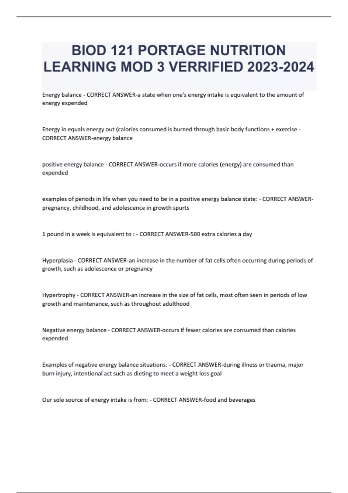 BIOD 121 PORTAGE NUTRITION LEARNING MOD 3 VERRIFIED Energy balance - CORRECT ANSWER-a state when one's energy intake is equivalent to the amount of energy expended Energy in equals energy out (calories consumed is burned through basic body functions + exercise - CORRECT ANSWER-energy balance positive energy balance - CORRECT ANSWER-occurs if more calories (energy) are consumed than expended examples of periods in life when you need to be in a positive energy balance state: - CORRECT ANSWERpregnancy, childhood, and adolescence in growth spurts 1 pound in a week is equivalent to : - CORRECT ANSWER-500 extra calories a day Hyperplasia - CORRECT ANSWER-an increase in the number of fat cells often occurring during periods of growth, such as adolescence or pregnancy Hypertrophy - CORRECT ANSWER-an increase in the size of fat cells, most often seen in periods of low growth and maintenance, such as throughout adulthood Negative energy balance - CORRECT ANSWER-occurs if fewer calories are consumed than calories expended Examples of negative energy balance situations: - CORRECT ANSWER-during illness or trauma, major burn injury, intentional act such as dieting to meet a weight loss goal Our sole source of energy intake is from: - CORRECT ANSWER-food and beverages Energy can be expended naturally via _____________ , _____________, and _________________ - CORRECT ANSWER-basal metabolism, the thermic effect of food, and thermogenesis Energy can be expended intentionally through _______________ - CORRECT ANSWER-physical activity (aka exercise) Two major components of energy expenditure are: - CORRECT ANSWER-basal metabolic rate and physical activity Basal metabolic rate (BMR) - CORRECT ANSWER-the number of calories used by the body while in a fasting state and accounts for approximately 60-70% of energy expenditure BMR varies by person based on factors such as: - CORRECT ANSWER-gender, lean body mass, body size, temperature, age, nervous system activities, levels of caffeine intake, and tobacco use BMR males: - CORRECT ANSWER-1 kcal/kg/hour BMR females: - CORRECT ANSWER-0.9 kcal/kg/hour As we age BMR declines by ______________% per decade so we must adjust eating habits to prevent weight gain. - CORRECT ANSWER-1-2 % Thermic effect of food (TEF) - CORRECT ANSWER-the energy used for digestion and absorption of food and accounts for approximately 10% of the calories expended. larger meals higher in protein result in a higher ________ - CORRECT ANSWER-thermic effect of food (TEF) Thermogenesis - CORRECT ANSWER-the ability to regulate temperature and activities such as fidgeting, maintaining body posture, and shivering. ( energy burned through this process is very small) Physical activity - CORRECT ANSWER-accounts for 15-40% of our energy expenditure