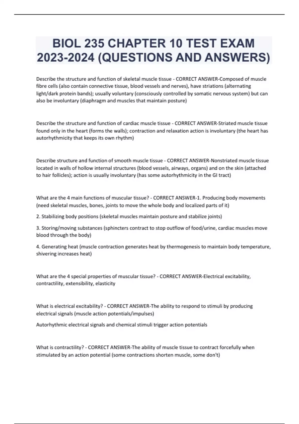 BIOL 235 CHAPTER 10 TEST EXAM (QUESTIONS AND ANSWERS) Describe the structure and function of skeletal muscle tissue - CORRECT ANSWER-Composed of muscle fibre cells (also contain connective tissue, blood vessels and nerves), have striations (alternating light/dark protein bands); usually voluntary (consciously controlled by somatic nervous system) but can also be involuntary (diaphragm and muscles that maintain posture) Describe the structure and function of cardiac muscle tissue - CORRECT ANSWER-Striated muscle tissue found only in the heart (forms the walls); contraction and relaxation action is involuntary (the heart has autorhythmicity that keeps its own rhythm) Describe structure and function of smooth muscle tissue - CORRECT ANSWER-Nonstriated muscle tissue located in walls of hollow internal structures (blood vessels, airways, organs) and on the skin (attached to hair follicles); action is usually involuntary (has some autorhythmicity in the GI tract) What are the 4 main functions of muscular tissue? - CORRECT ANSWER-1. Producing body movements (need skeletal muscles, bones, joints to move the whole body and localized parts of it) 2. Stabilizing body positions (skeletal muscles maintain posture and stabilize joints) 3. Storing/moving substances (sphincters contract to stop outflow of food/urine, cardiac muscles move blood through the body) 4. Generating heat (muscle contraction generates heat by thermogenesis to maintain body temperature, shivering increases heat) What are the 4 special properties of muscular tissue? - CORRECT ANSWER-Electrical excitability, contractility, extensibility, elasticity What is electrical excitability? - CORRECT ANSWER-The ability to respond to stimuli by producing electrical signals (muscle action potentials/impulses) Autorhythmic electrical signals and chemical stimuli trigger action potentials What is contractility? - CORRECT ANSWER-The ability of muscle tissue to contract forcefully when stimulated by an action potential (some contractions shorten muscle, some don't) What is extensibility? - CORRECT ANSWER-The ability of muscle to stretch without damage (smooth muscle stretches the most); connective tissue keeps muscles within contractile range so they don't get damaged What is elasticity? - CORRECT ANSWER-The ability of muscular tissue to return to its original length and shape after contraction or extension What is a somatic motor neuron? - CORRECT ANSWER-Neurons that stimulate skeletal muscle to contract (have a threadlike axon extending from the brain to a group of muscle fibres) Describe the nerve and blood vessel components of skeletal muscles - CORRECT ANSWER-Skeletal muscles have an artery and 1 or 2 accompanying veins that go with each nerve penetrating a skeletal muscle (capillaries are also plentiful in muscular tissue) Describe the connective tissue components of skeletal muscles - CORRECT ANSWER-Connective tissue surrounds and protects muscle tissue Hypodermis (sub-Q layer) separates muscles from skin and provides a pathway for nerves/blood/lymphatic vessels Fascia is a dense band of irregular connective tissue that supports and surrounds muscles (holds muscles with similar functions together) What is the epimysium? - CORRECT ANSWER-Outer layer of connective tissue covering muscles What is the perimysium? - CORRECT ANSWER-Connective tissue sheath that surrounds groups of muscle fibres (separated into fascicles; this is where meat tears) What is the endomysium? - CORRECT ANSWER-Connective tissue that penetrates fascicles and separates individual muscle fibres from each other What is a tendon? - CORRECT ANSWER-A rope-like connective tissue that attaches muscle to the periosteum of a bone What is an aponeurosis? - CORRECT ANSWER-A broad, flat tissue (like a tendon) What is a sarcolemma? - CORRECT ANSWER-The plasma membrane of a muscle cell What are transverse (T) tubules? - CORRECT ANSWER-Inward folds of the sarcolemma that are filled with interstitial fluid and tunnel in toward the centre of each muscle fibre (part of microscopic anatomy) What is sarcoplasm? - CORRECT ANSWER-Cytoplasm of a muscle fibre, found within sarcolemma and contains glycogen and myoglobin (protein that binds oxygen and releases it for ATP production) What are myofibrils? - CORRECT ANSWER-Contractive organelles of skeletal muscle (striations that extend the entire length of a muscle) What is the sarcoplasmic reticulum (SR)? - CORRECT ANSWER-Network of fluid-filled membranous sacs that encircle each myofibril and store calcium ions in a relaxed muscle fibre, include: terminal cisterns (dilated end sacs of the SR that bump against T-tubules from both sides and release calcium ions that trigger muscle contraction) triad (formed by a T-tubule and 2 terminal cisterns) What is muscular hypertrophy? - CORRECT ANSWER-Muscle growth (enlargement of existing fibres) that occurs after birth, results from repetitive forceful muscular activity (increases production of myofibrils, mitochondria, SR and other organelles) What is fibrosis? - CORRECT ANSWER-The replacement of muscle fibres by fibrous scar tissue What is muscular atrophy? - CORRECT ANSWER-A decrease in the size of individual muscle fibres resulting from loss of myofibrils (2 types): disuse atrophy: caused when muscles aren't used (reversible) denervation atrophy: when nerve supply is disrupted or cut, fibres are irreversibly replaced by fibrous connective tissue (muscles can shrink to 1/4 size)