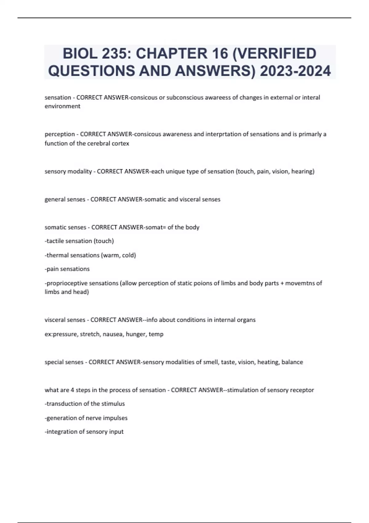 BIOL 235: CHAPTER 16 (VERRIFIED QUESTIONS AND ANSWERS) sensation - CORRECT ANSWER-consicous or subconscious awareess of changes in external or interal environment perception - CORRECT ANSWER-consicous awareness and interprtation of sensations and is primarly a function of the cerebral cortex sensory modality - CORRECT ANSWER-each unique type of sensation (touch, pain, vision, hearing) general senses - CORRECT ANSWER-somatic and visceral senses somatic senses - CORRECT ANSWER-somat= of the body -tactile sensation (touch) -thermal sensations (warm, cold) -pain sensations -proprioceptive sensations (allow perception of static poions of limbs and body parts + movemtns of limbs and head) visceral senses - CORRECT ANSWER--info about conditions in internal organs ex:pressure, stretch, nausea, hunger, temp special senses - CORRECT ANSWER-sensory modalities of smell, taste, vision, heating, balance what are 4 steps in the process of sensation - CORRECT ANSWER--stimulation of sensory receptor -transduction of the stimulus -generation of nerve impulses -integration of sensory input describe stimulation of sensory receptor - CORRECT ANSWER-a stimulus in the sensory receptor's receptive field occurs describe transduction of the stimulus - CORRECT ANSWER-a sensory receptor transfuces/converts energy from stimulus into a graded potential. -each receptor can only transudce one kind of stimulus describe generation of nerve impulses - CORRECT ANSWER--when graded potential reaches threshold, it triggers nerve impulses, which propogate toward teh CNS describe integration of sensory input - CORRECT ANSWER-a particular region of the CNS receives and integrates the senory nerve impulses -consicous sensations/perceptions are integrated in cerebral cortex what are the factors to classify sensory receptors based on microscopic structure - CORRECT ANSWER-- free nerve endings -encapsulated nerve endings -seperate cells free nerve endings - CORRECT ANSWER-bare dendrites; no structural specifalizations -ex: receptors for pain, touch encapsulated nerve endings - CORRECT ANSWER-receptors for pressure, vibration -dendrites enclosed in connective tissue capsule with distinct structure separate cells - CORRECT ANSWER-sensory receprots for some special senses -hair cells, gustatory receptor cells in taste buds, photoreceptors generator potential - CORRECT ANSWER-when stimulated, dendrites of free nerve endings "encapsulated nerve endings" produce this potential