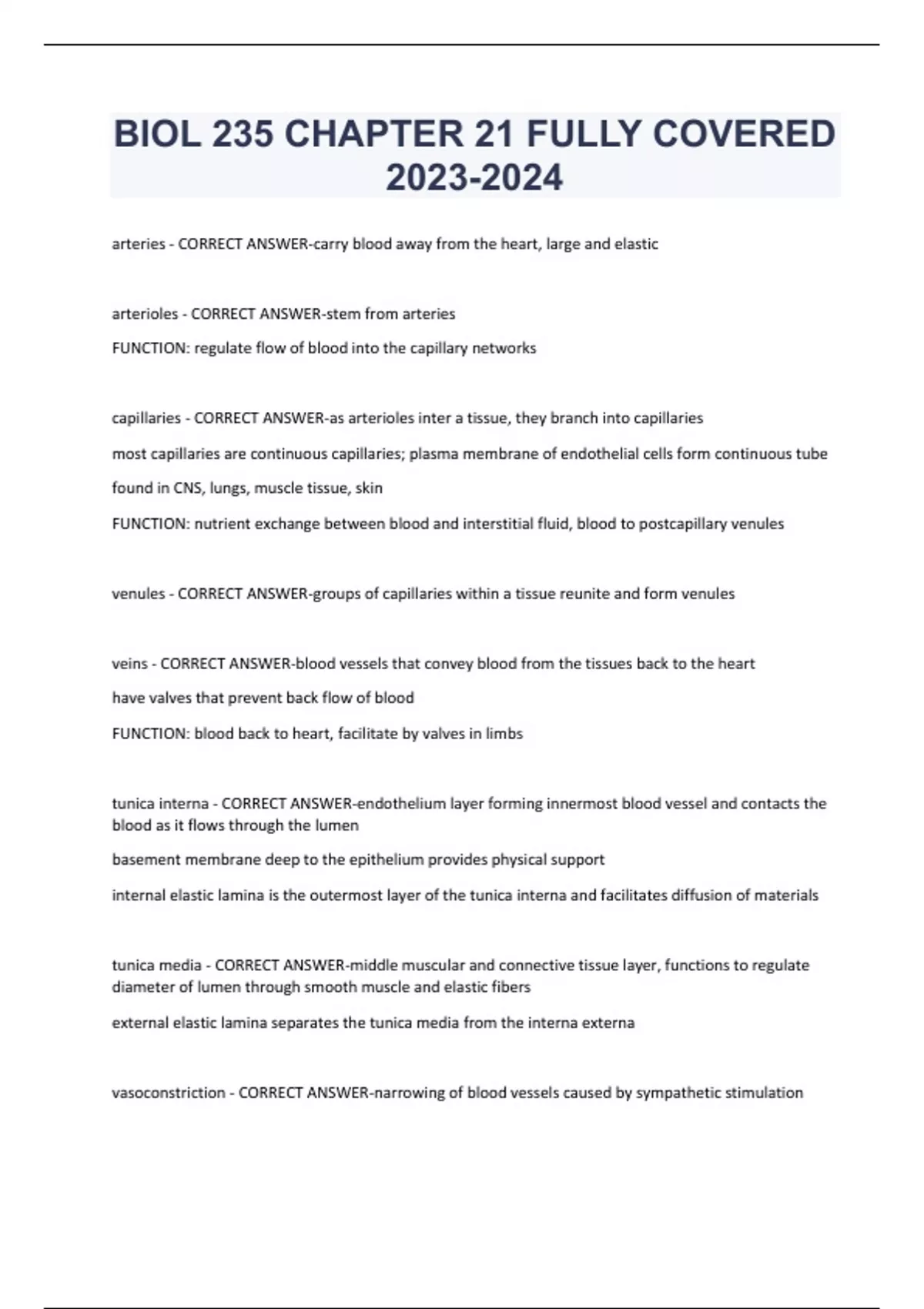 BIOL 235 CHAPTER 21 FULLY COVERED arteries - CORRECT ANSWER-carry blood away from the heart, large and elastic arterioles - CORRECT ANSWER-stem from arteries FUNCTION: regulate flow of blood into the capillary networks capillaries - CORRECT ANSWER-as arterioles inter a tissue, they branch into capillaries most capillaries are continuous capillaries; plasma membrane of endothelial cells form continuous tube found in CNS, lungs, muscle tissue, skin FUNCTION: nutrient exchange between blood and interstitial fluid, blood to postcapillary venules venules - CORRECT ANSWER-groups of capillaries within a tissue reunite and form venules veins - CORRECT ANSWER-blood vessels that convey blood from the tissues back to the heart have valves that prevent back flow of blood FUNCTION: blood back to heart, facilitate by valves in limbs tunica interna - CORRECT ANSWER-endothelium layer forming innermost blood vessel and contacts the blood as it flows through the lumen basement membrane deep to the epithelium provides physical support internal elastic lamina is the outermost layer of the tunica interna and facilitates diffusion of materials tunica media - CORRECT ANSWER-middle muscular and connective tissue layer, functions to regulate diameter of lumen through smooth muscle and elastic fibers external elastic lamina separates the tunica media from the interna externa vasoconstriction - CORRECT ANSWER-narrowing of blood vessels caused by sympathetic stimulation