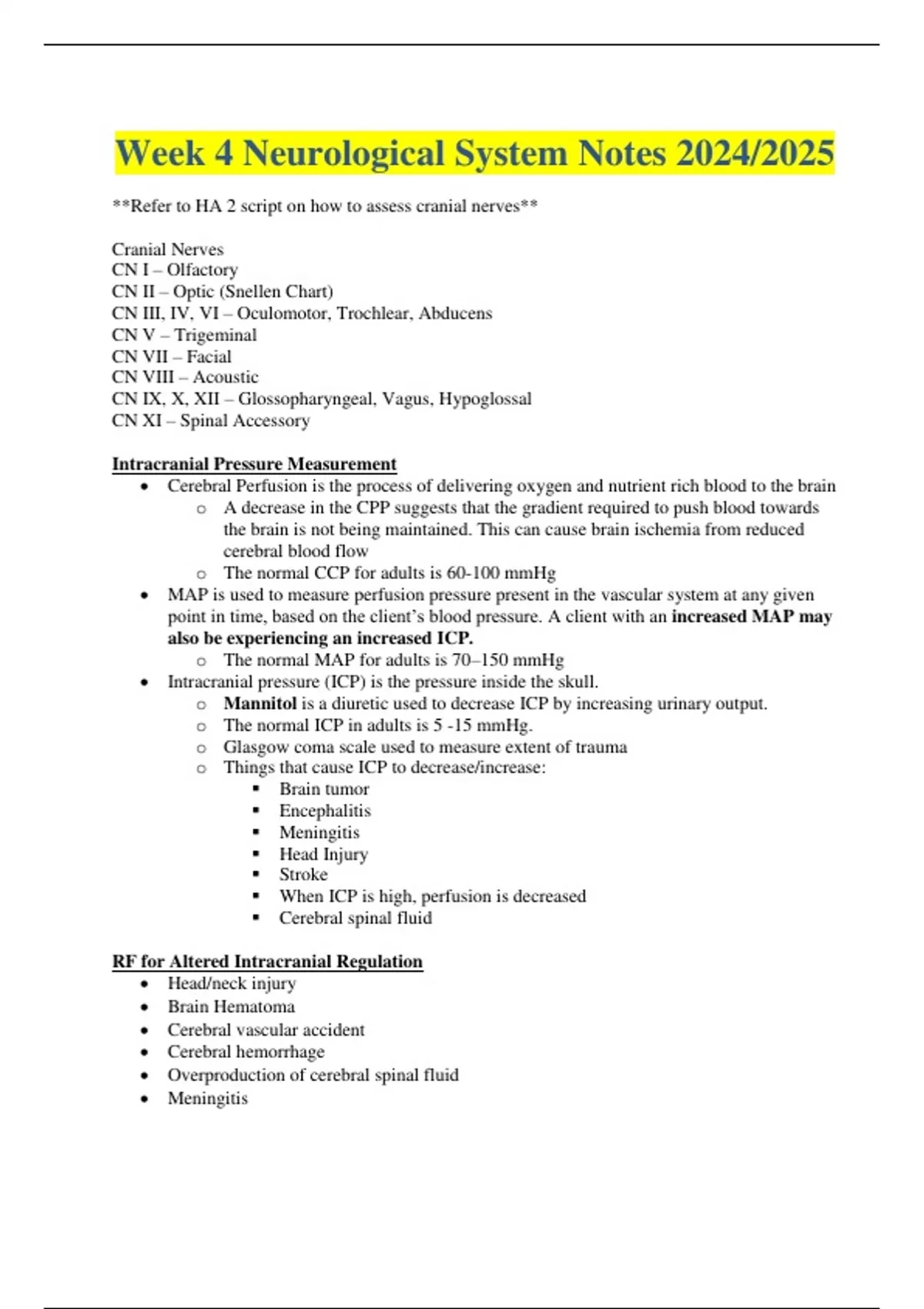 Week 4 Neurological System Notes 2024/2025 **Refer to HA 2 script on how to assess cranial nerves** Cranial Nerves CN I – Olfactory CN II – Optic (Snellen Chart) CN III, IV, VI – Oculomotor, Trochlear, Abducens CN V – Trigeminal CN VII – Facial CN VIII – Acoustic CN IX, X, XII – Glossopharyngeal, Vagus, Hypoglossal CN XI – Spinal Accessory Intracranial Pressure Measurement • Cerebral Perfusion is the process of delivering oxygen and nutrient rich blood to the brain o A decrease in the CPP suggests that the gradient required to push blood towards the brain is not being maintained. This can cause brain ischemia from reduced cerebral blood flow o The normal CCP for adults is 60-100 mmHg • MAP is used to measure perfusion pressure present in the vascular system at any given point in time, based on the client’s blood pressure. A client with an increased MAP may also be experiencing an increased ICP. o The normal MAP for adults is 70–150 mmHg • Intracranial pressure (ICP) is the pressure inside the skull. o Mannitol is a diuretic used to decrease ICP by increasing urinary output. o The normal ICP in adults is 5 -15 mmHg. o Glasgow coma scale used to measure extent of trauma o Things that cause ICP to decrease/increase: ▪ Brain tumor ▪ Encephalitis ▪ Meningitis ▪ Head Injury ▪ Stroke ▪ When ICP is high, perfusion is decreased ▪ Cerebral spinal fluid RF for Altered Intracranial Regulation • Head/neck injury • Brain Hematoma • Cerebral vascular accident • Cerebral hemorrhage