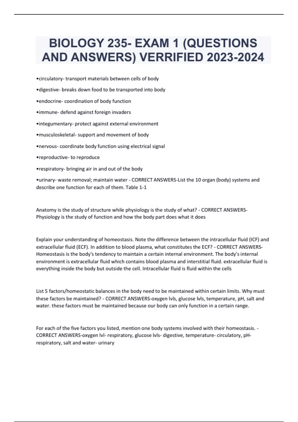 BIOLOGY 235- EXAM 1 (QUESTIONS AND ANSWERS) VERRIFIED •circulatory- transport materials between cells of body •digestive- breaks down food to be transported into body •endocrine- coordination of body function •immune- defend against foreign invaders •integumentary- protect against external environment •musculoskeletal- support and movement of body •nervous- coordinate body function using electrical signal •reproductive- to reproduce •respiratory- bringing air in and out of the body •urinary- waste removal; maintain water - CORRECT ANSWERS-List the 10 organ (body) systems and describe one function for each of them. Table 1-1 Anatomy is the study of structure while physiology is the study of what? - CORRECT ANSWERSPhysiology is the study of function and how the body part does what it does Explain your understanding of homeostasis. Note the difference between the intracellular fluid (ICF) and extracellular fluid (ECF). In addition to blood plasma, what constitutes the ECF? - CORRECT ANSWERSHomeostasis is the body's tendency to maintain a certain internal environment. The body's internal environment is extracellular fluid which contains blood plasma and interstitial fluid. extracellular fluid is everything inside the body but outside the cell. Intracellular fluid is fluid within the cells List 5 factors/homeostatic balances in the body need to be maintained within certain limits. Why must these factors be maintained? - CORRECT ANSWERS-oxygen lvls, glucose lvls, temperature, pH, salt and water. these factors must be maintained because our body can only function in a certain range. For each of the five factors you listed, mention one body systems involved with their homeostasis. - CORRECT ANSWERS-oxygen lvl- respiratory, glucose lvls- digestive, temperature- circulatory, pHrespiratory, salt and water- urinary Draw an animal cell including the following structures: cell membrane, nucleus, endoplasmic reticulum, Golgi apparatus, mitochondria and lysosomes. - CORRECT ANSWERS-DRAW ON PAPER! In what part of the cell are chromosomes located? - CORRECT ANSWERS-the nucleus What is the function of ribosomes? Rough endoplasmic reticulum and Golgi apparatus? - CORRECT ANSWERS-•ribosomes is where proteins are made •rough ER is stubbed with ribosomes and responsible for assembly of proteins •golgi apparatus- modify, transport, sorting molecules Briefly, what is the mitochondria? Lysosomes? - CORRECT ANSWERS-•mitochondria- where ATP is made •lysosome- responsible for waste Explain the difference between desmosomes and tight junctions. Fig. 3.8 - CORRECT ANSWERSDESMOSOMES anchor cells to each other and TIGHT JUNCTION anchor cells and prevent fluid and molecules from moving between cells What type of molecules can pass freely through the lipid-bilayer part of the cell membrane? What properties determine if a molecule will pass through? Fig. 5.7 - CORRECT ANSWERS-hydrophobic molecules can pass freely. concentration gradient determines if the molecule will pass freely Explain what a concentration gradient is. Can molecules flow up their concentration gradient? Explain. - CORRECT ANSWERS-Concentration gradient is the difference in concentration of a substance in two places. One side is high and the other is low in concentration. Molecules can flow up their concentration gradient. Flowing against it requires active transport because energy is needed for the substance that is low in one place to move on to the higher concentration sid