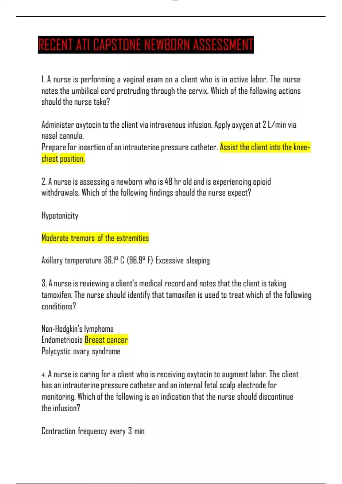RECENT ATI CAPSTONE NEWBORN ASSESSMENT 1. A nurse is performing a vaginal exam on a client who is in active labor. The nurse notes the umbilical cord protruding through the cervix. Which of the following actions should the nurse take? Administer oxytocin to the client via intravenous infusion. Apply oxygen at 2 L/min via nasal cannula. Prepare for insertion of an intrauterine pressure catheter. Assist the client into the knee-chest position. 2. A nurse is assessing a newborn who is 48 hr old and is experiencing opioid withdrawals. Which of the following findings should the nurse expect? Hypotonicity Moderate tremors of the extremities Axillary temperature 36.1° C (96.9° F) Excessive sleeping 3. A nurse is reviewing a client's medical record and notes that the client is taking tamoxifen. The nurse should identify that tamoxifen is used to treat which of the following conditions? Non-Hodgkin's lymphoma Endometriosis Breast cancer Polycystic ovary syndrome 4. A nurse is caring for a client who is receiving oxytocin to augment labor. The client has an intrauterine pressure catheter and an internal fetal scalp electrode for monitoring. Which of the following is an indication that the nurse should discontinue the infusion? Contraction frequency every 3 min Contraction duration of 100 seconds Fetal heart rate with moderate variability Fetal heart rate of 118/min 5. A nurse providing dietary teaching for a client who is at 29 weeks of gestation and has phenylketonuria. Which of the following suggested foods should the nurse include in the teaching? A peanut butter sandwich on wheat bread A sliced apple and red grapes A chocolate chip cookie with a glass of skim milk A scrambled egg with cheddar cheese 6. A nurse is reviewing a laboratory report for a client who is at 33 weeks of gestation and has preeclampsia. Which of the following laboratory results should the nurse report to the provider? BUN 35 mg/dL Hgb 15 mg/dL Bilirubin 0.6 mg/dL Hct 37% 7. A nurse is providing teaching about newborn safety to a client who is being admitted for induction of labor. Which of the following client statements indicate an understanding of the teaching? "I will check the identication badge of anyone who removes my baby from our room." "I should include a photo of my baby along with any public birth announcements to social media." "I will allow my baby to sleep on the bed in my room when I am in the shower." "I should expect the nurses to carry my baby in their arms to the nursery." 8. A nurse is assessing a client who is at 31 weeks of gestation. Which of the following findings should the nurse identify as an indication of a potential prenatal complication? Periodic tingling of fingers Absence of clonus Leg cramps Blurred vision 9. A nurse is reviewing the laboratory results of a newborn who is 24 hr old. Which of the following findings should the nurse report to the provider? Hemoglobin 12 g/dL Glucose 50 mg/dL Bilirubin 4 mg/dL Platelets 200,000/mm 10. A nurse is caring for a client who is in labor and has an epidural for pain control. Which of the following clinical manifestations is an adverse effect of epidural anesthesia? Polyuria Hypertension Pruritus Dry mouth 11. A nurse is teaching a client about using an intrauterine device (IUD) for contraception. Which of the following client statements indicate an understanding of the teaching? "I will need to have the IUD replaced each year." "I will need to apply a spermicide prior to intercourse." "I should expect my periods to stop while I have the IUD." "I should check for the string each month after menstruation." 12. A nurse is assessing a newborn who is 10 hr old. Which of the following findings should the nurse report to the provider? Axillary temperature 36.5° C (97.7° F) Nasal faring Heart rate 158/min One void since birth 13. A nurse is assessing a client who gave birth 1 week ago. The client states, "I don't know what's wrong. I love my baby, but I feel so let down and I seem to cry for no reason." The nurse should identify that the client is experiencing which of the following emotional responses to birth? Postpartum depression Taking-in phase Postpartum blues Taking-hold phase 14. A nurse is providing teaching to a group of women about risk factors for ovarian cancer. Which of the following risk factors should the nurse include? (Select all that apply.) Nulliparity History of breastfeeding Previous use of oral contraceptives History of breast cancer Hormone replacement therapy 15. A nurse is caring for a client who is at 38 weeks of gestation and is experiencing continuous abdominal pain and vaginal bleeding. The client has a history of cocaine use. The nurse should identify that the client is likely experiencing which of the following complications? Abruptio placentae Hydatidiform mole Preterm labor Placenta previa 16. A nurse is caring for a client who is postpartum, has a deep-vein thrombosis, and is receiving heparin therapy via subcutaneous injections. Which of the following actions should the nurse take? Request a prescription for PRN aspirin from the provider. Massage the injection site thoroughly following administration. Instruct the client that they cannot breastfeed while receiving heparin. Administer the injection in the client's abdomen.