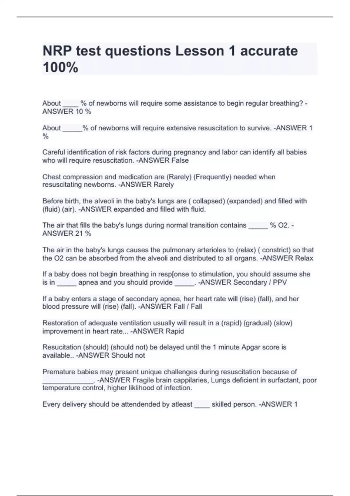 NRP test questions Lesson 1 accurate 100% About ____ % of newborns will require some assistance to begin regular breathing? -ANSWER 10 % About _____% of newborns will require extensive resuscitation to survive. -ANSWER 1 % Careful identification of risk factors during pregnancy and labor can identify all babies who will require resuscitation. -ANSWER False Chest compression and medication are (Rarely) (Frequently) needed when resuscitating newborns. -ANSWER Rarely Before birth, the alveoli in the baby's lungs are ( collapsed) (expanded) and filled with (fluid) (air). -ANSWER expanded and filled with fluid. The air that fills the baby's lungs during normal transition contains _____ % O2. -ANSWER 21 %